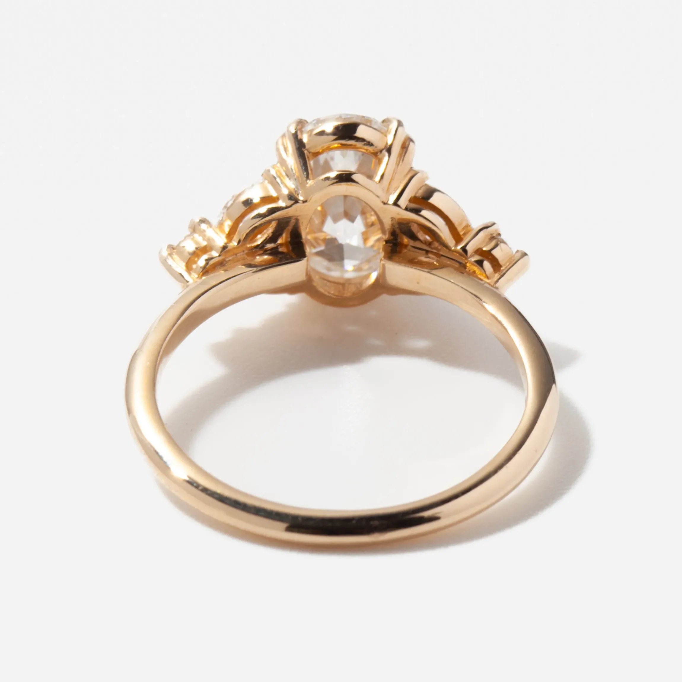 Introducing the Goldie ring, a perfect blend of elegance and playfulness. At the center is a substantial 2.14 carat oval lab-grown diamond. It is complemented by two marquise and a round diamond on each side. Set in 14 karat yellow gold, this ring exudes timeless beauty with a touch of whimsy. Ideal for statement-makers, it effortlessly transitions from formal occasions to everyday glamour. Made in the U.S.A.