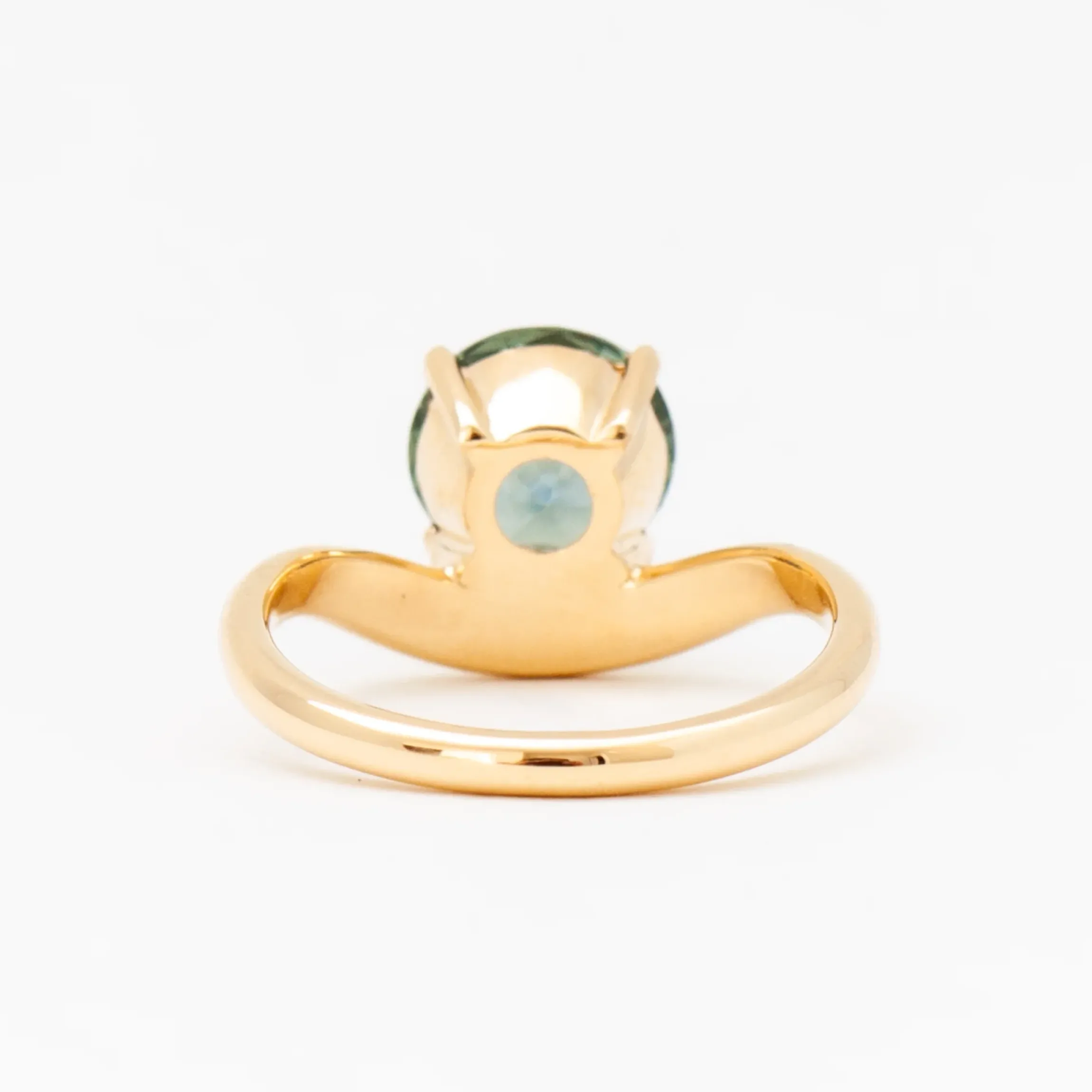 A true work of art, this new ring from The Future Fine features organic gold lines that take a gentle dip to mirror the unique curves of its center sapphire. This one-of-a-kind Piscine features a glimmering teal sapphire from Montana that pairs beautifully with the yellow hue of the setting. Its asymmetric design creates a dream-like quality, while the offset stone glimmers in perfect harmony like ripples on a tranquil pool. Designed and made in the U.S.A.