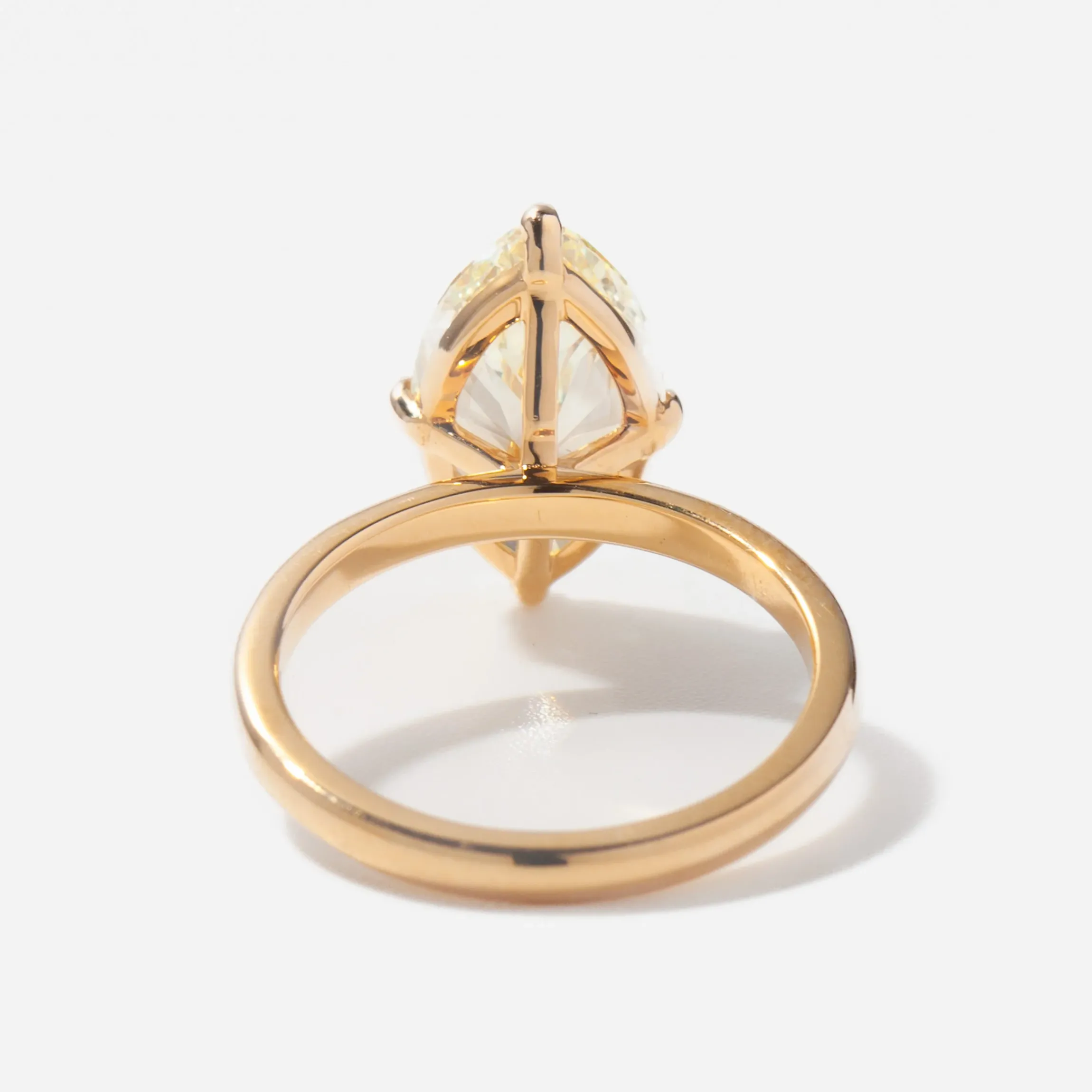 The subtle architecture of this solitaire setting lets the fantastic faceting of this unusual diamond shine its brightest. With gorgeous curves, sharp facets, and a distinctive quelet at its center, this elongated diamond blends soft curves, strong geometry, and remarkable sparkle into one look. The height of the gallery allows for bands to Pair it with step-cut diamond bands for understated shimmer or amp up its brilliance with a stack of eternity bands. Made in the U.S.A.