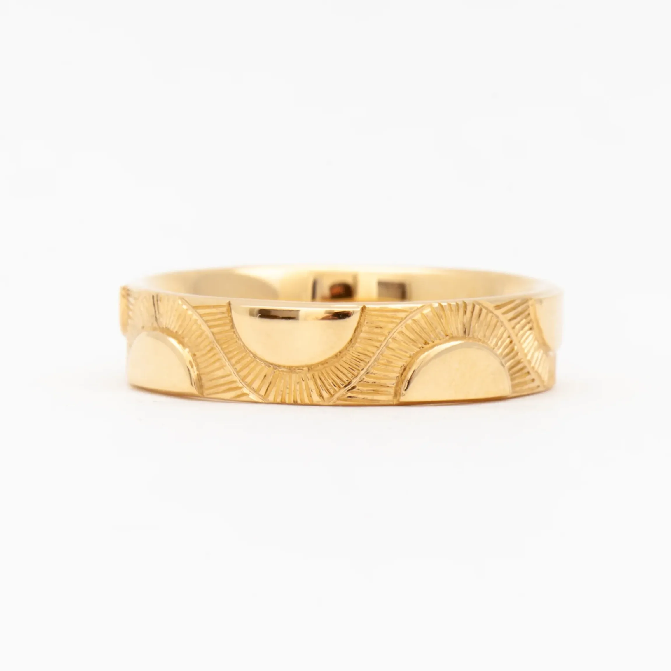The engraved sun wedding band is a modern design an artful twist. This band features an interior comfort fit band, and on the outside a geometric engraving in the shape of a sun beaming with light.