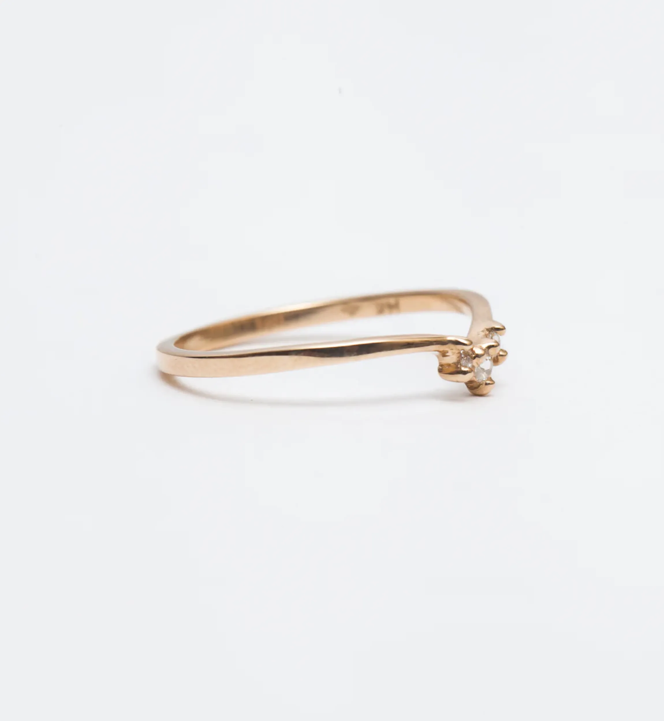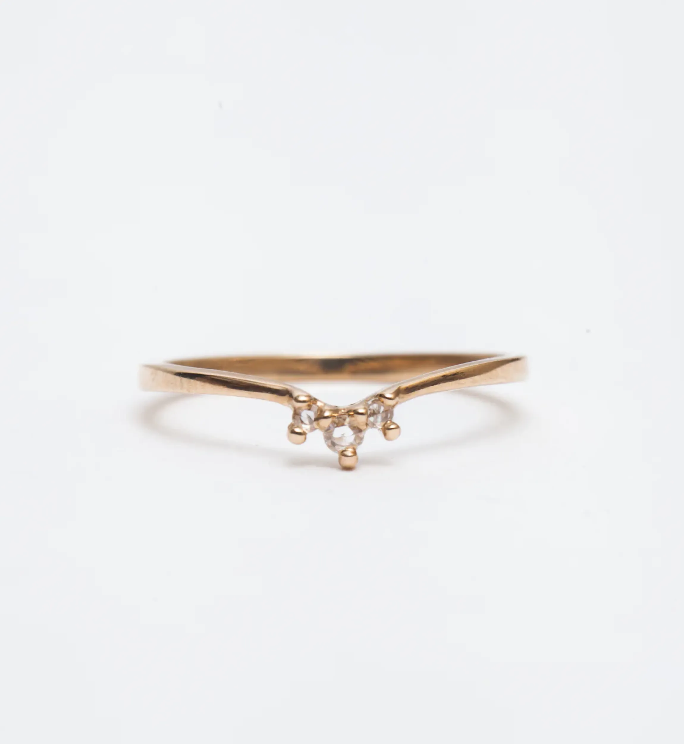 Big sparkle comes in small packages like the triple of rose-cut diamonds that accent the subtle peak of this gold ring. A fundamental ring in Laurie Fleming’s collection, wear this piece as the foundation of any stack. Use it as a subtle topper over her more extravagant pieces or wear them in a pair to frame your engagement ring. Made in Canada.