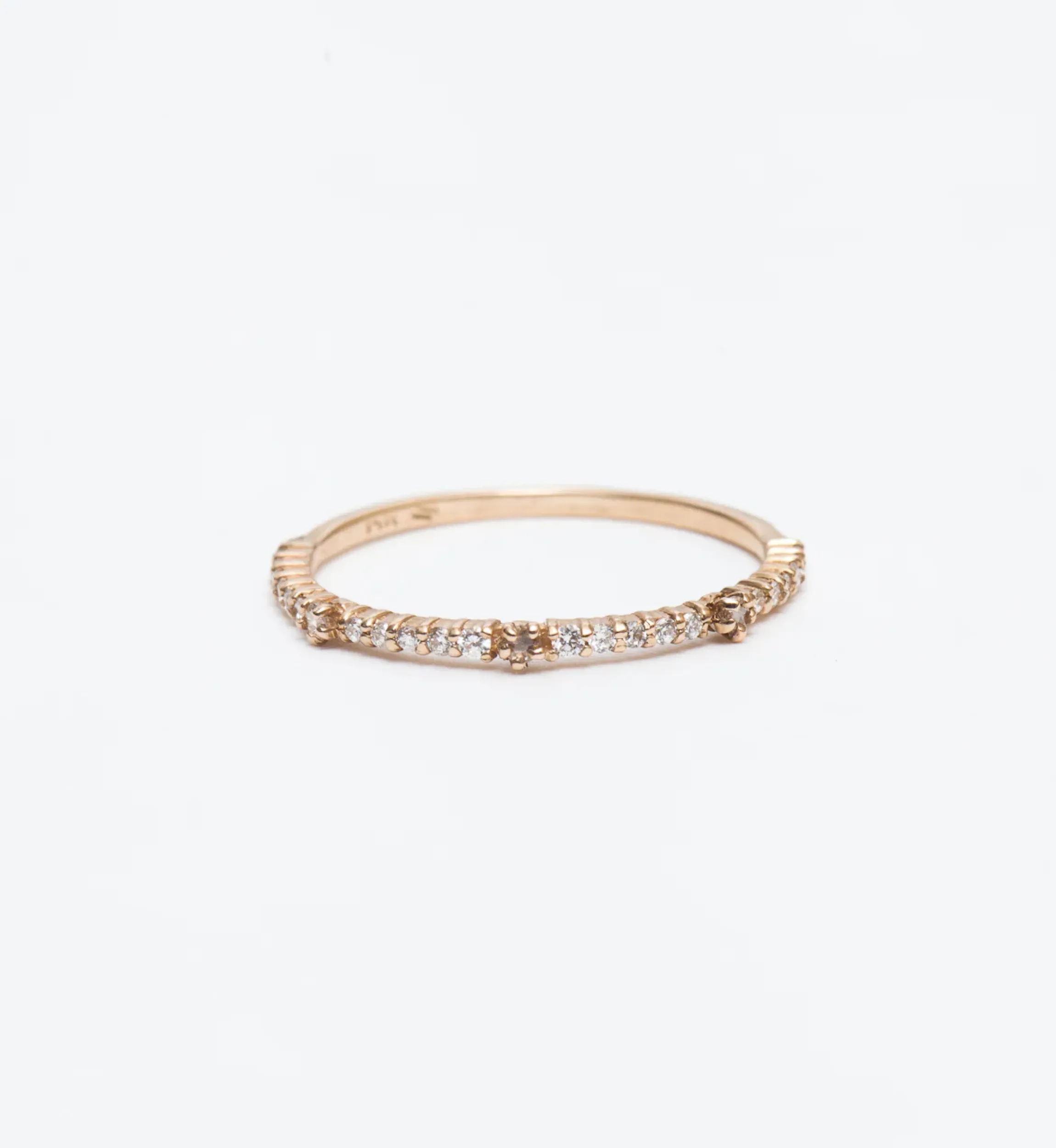 The dreamy, delicate setting of this half-eternity diamond band combines the timeless sparkle of round brilliant diamonds with the antique shimmer of rose-cut diamonds. Ultra-thin, yet loaded with life and fire, this band stacks effortlessly with anything and everything. We even love it on the right hand as a perfect dose of brightness to balance against a bridal set. Made in Canada.