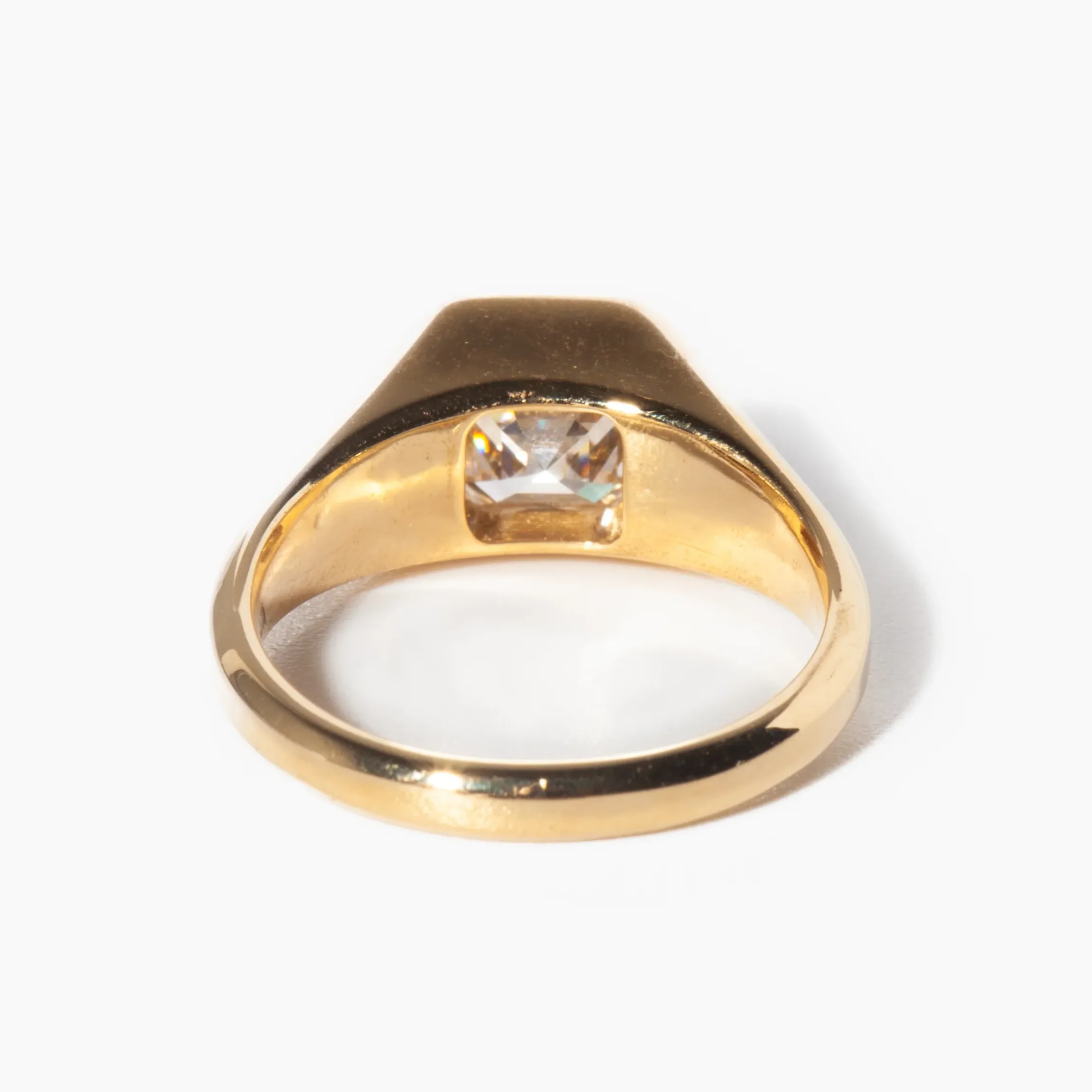 The luxurious and bold Reverence setting from The Future Fine is heavy in gold with a thick band that beautifully tapers and pays tribute to its diamond centerpiece. This one-of-a-kind Reverence features cradling prongs and a step-cut asscher diamond, creating a modern and unique silhouette for this signet ring. Made in the U.S.A.