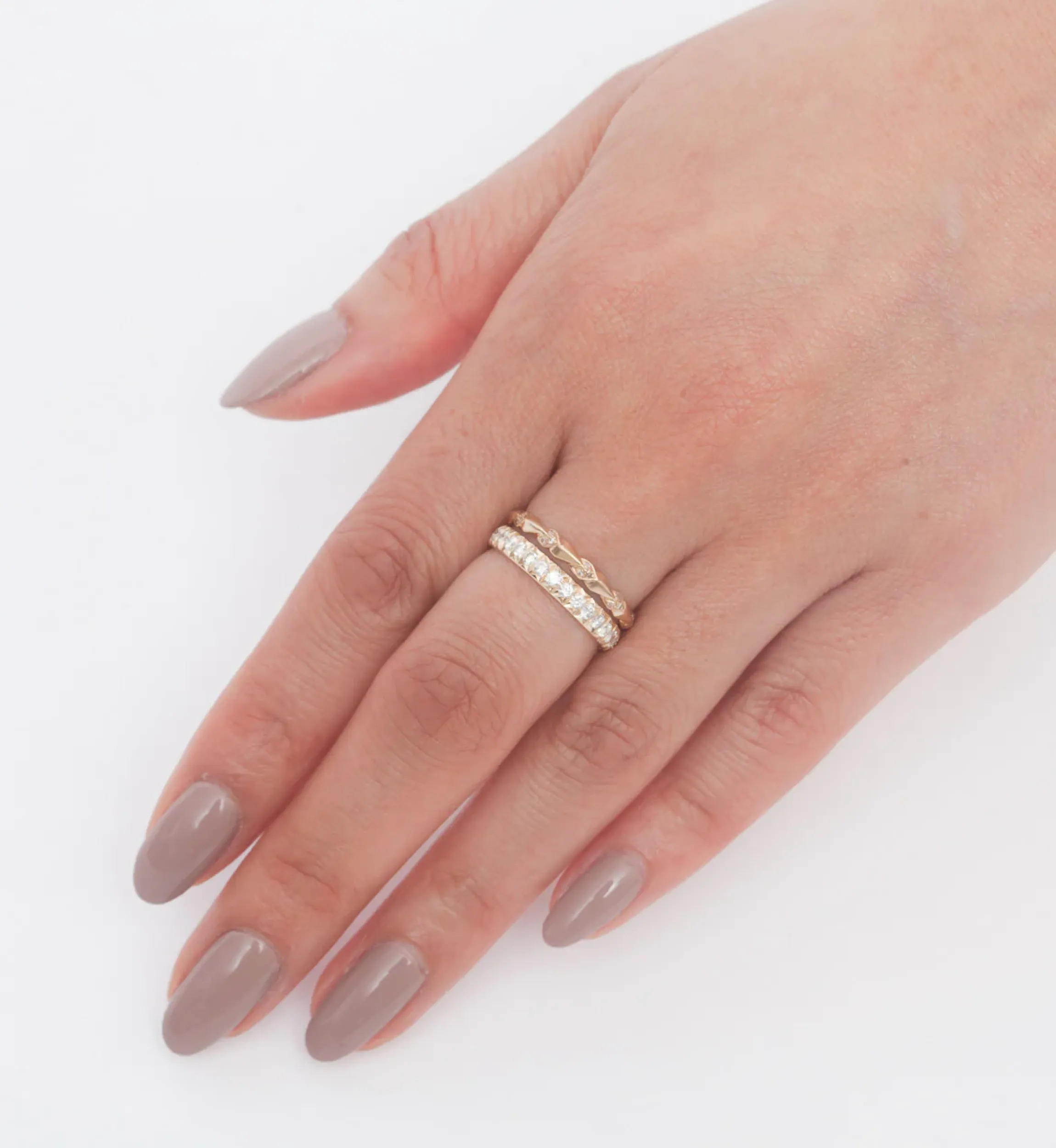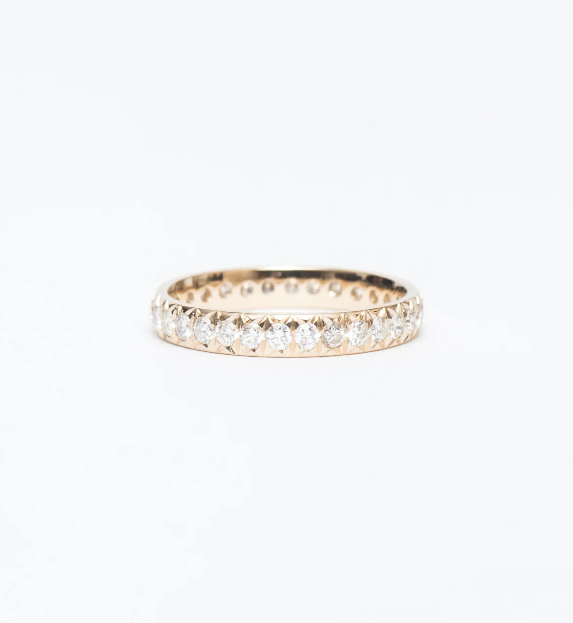 There’s no way to ignore the sparkling white diamonds that encircle this stunning eternity band since each one is carefully hand set into rich yellow gold. It’d be a shame to hide stones this brilliant, so Anna Sheffield has the entire band cut by hand, removing as much metal as possible to let the diamonds shine. Pair it with skinny diamond bands to create dynamic combinations of shape and scale. Designed in New York.