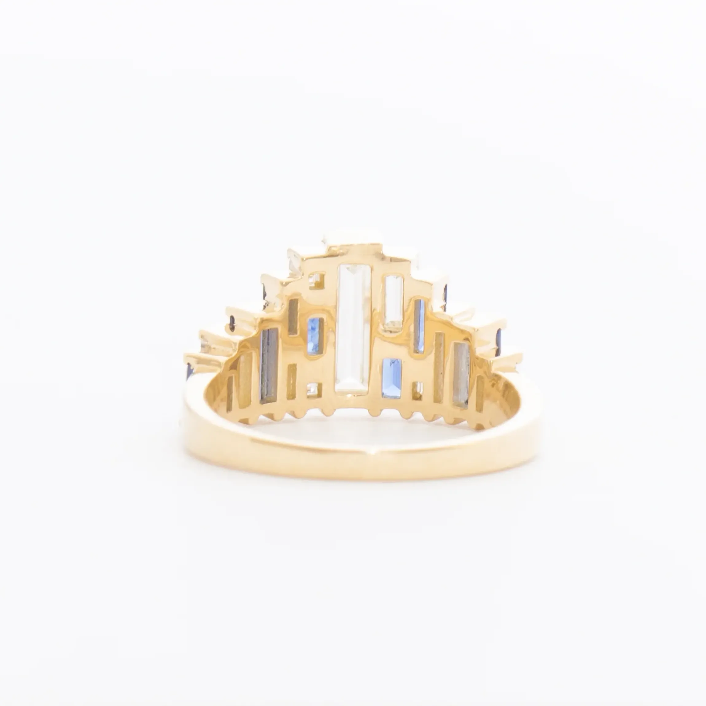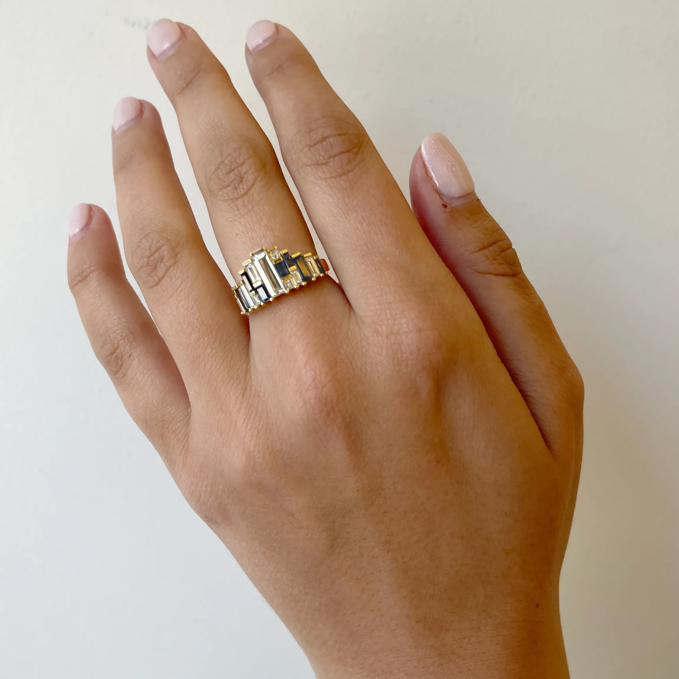 Artemer does it again with this geometric piece of perfection. Both diamond and sapphire baguettes combine to create a staggering, shimmering silhouette. Wear it solo as a modern engagement ring or pair it with a plain or textured gold band. Made in Israel.