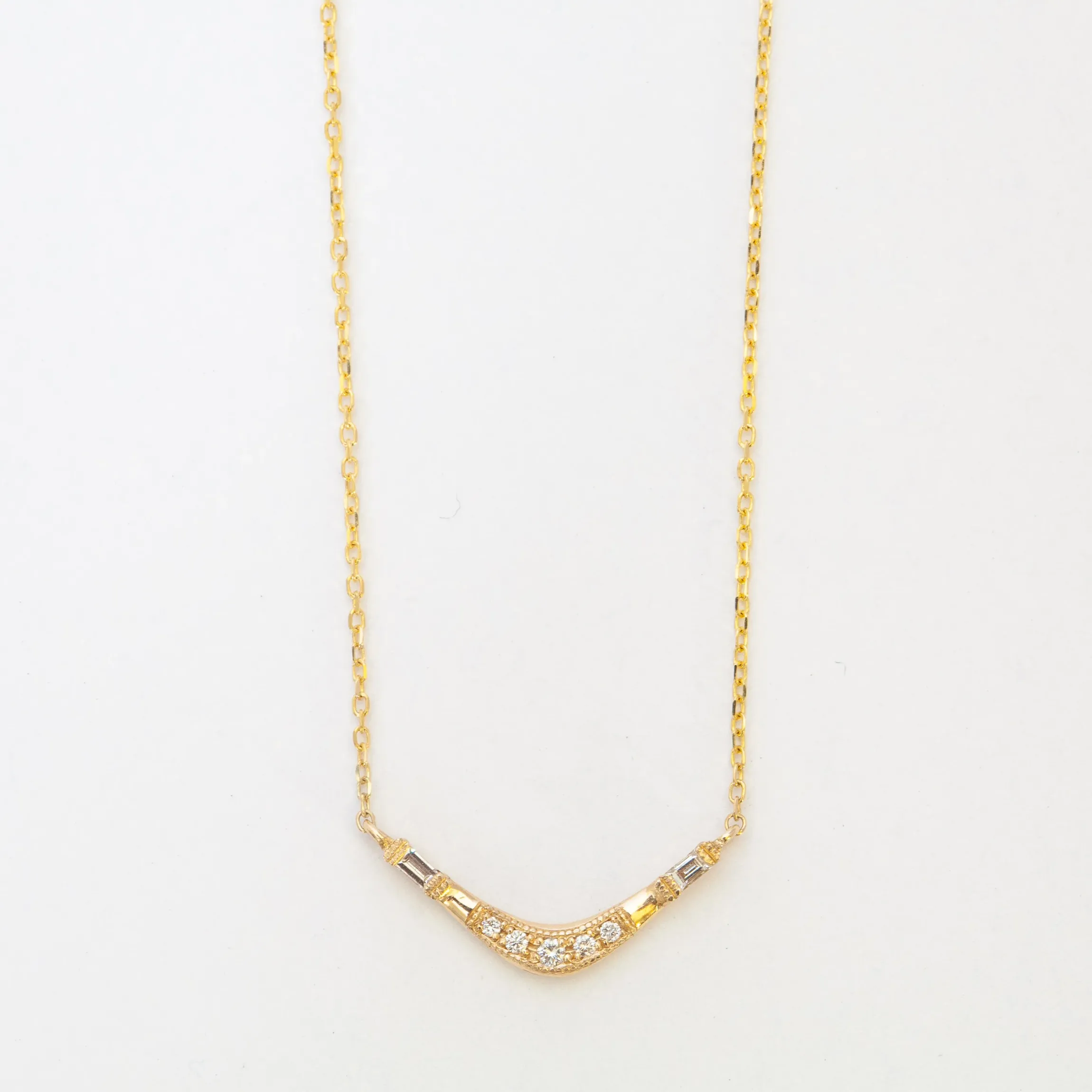Light plays across the graceful arch of this gold necklace, with delicate embellishment and mixed diamond cuts creating a symphony of different textures and shine. At the center, a suite of five round diamonds tapers into half bezel-set baguette diamonds, drawing the eye naturally into the fine diamond-cut chain. Finished with a spring-ring clasp. Made in the U.S.A.
