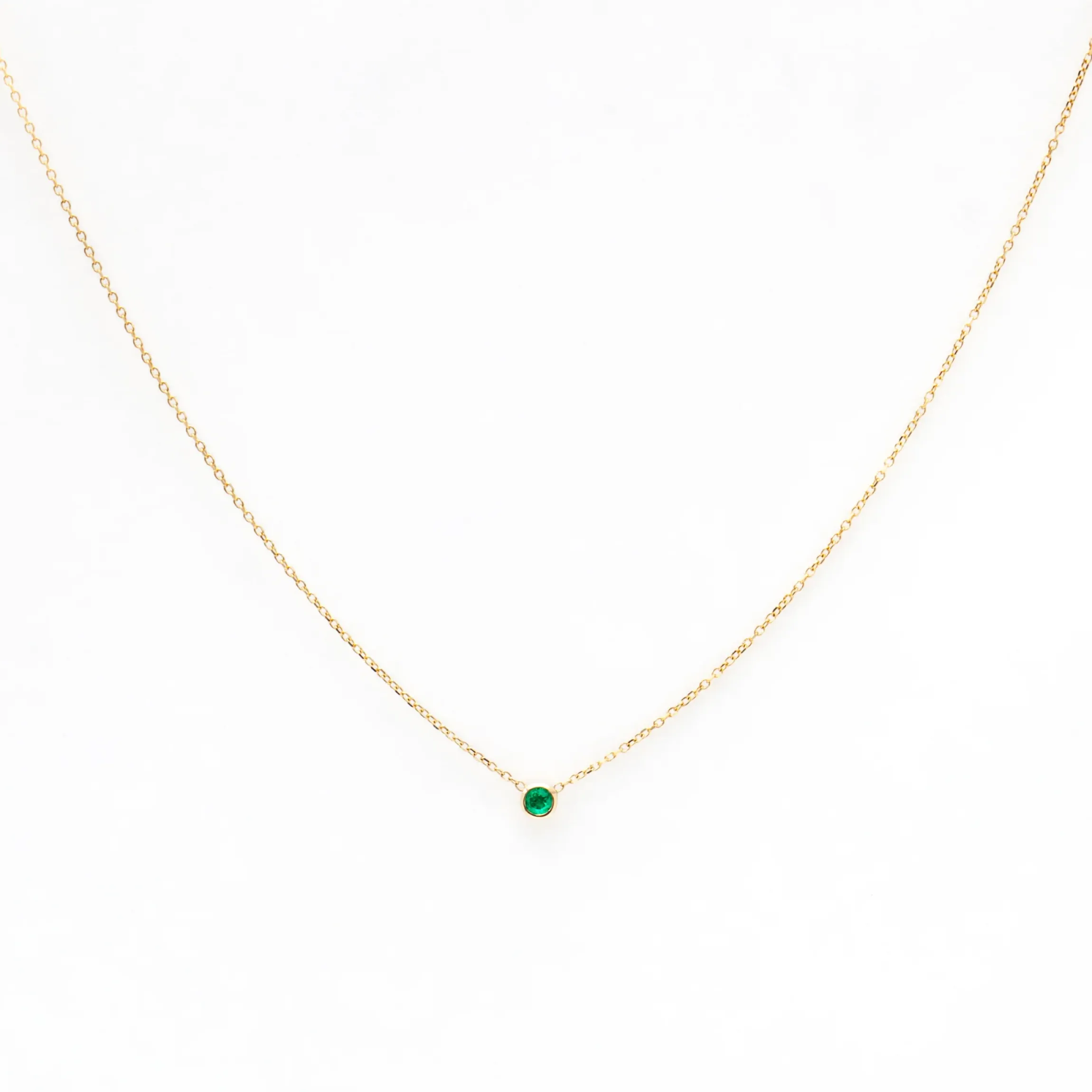 Just because the emerald is all by its lonesome doesn’t mean it’ll be ignored. If anything, the delicate proportions and concise design make it impossible to miss the elegant shine of this round green emerald hanging from fine gold chain. Whether you always walk out the door with a layer of three necklaces or you’re just looking for the one perfect item to make your outfit, this necklace will be the answer. Finished with a lobster clasp closure. Made in the U.S.A.