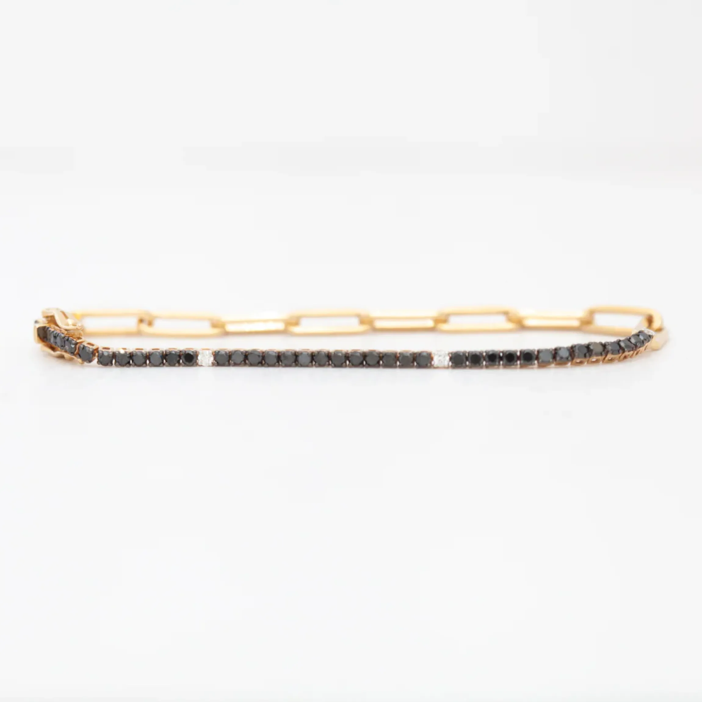 The classic tennis bracelet just got a little bit more fun. Add this unique bracelet featuring a mix of black diamonds, white diamonds, and 14 karat gold paperclip chain to your everyday stack. Dainty and fashion forward, this bracelet will catch the light and sparkle all day and all night.