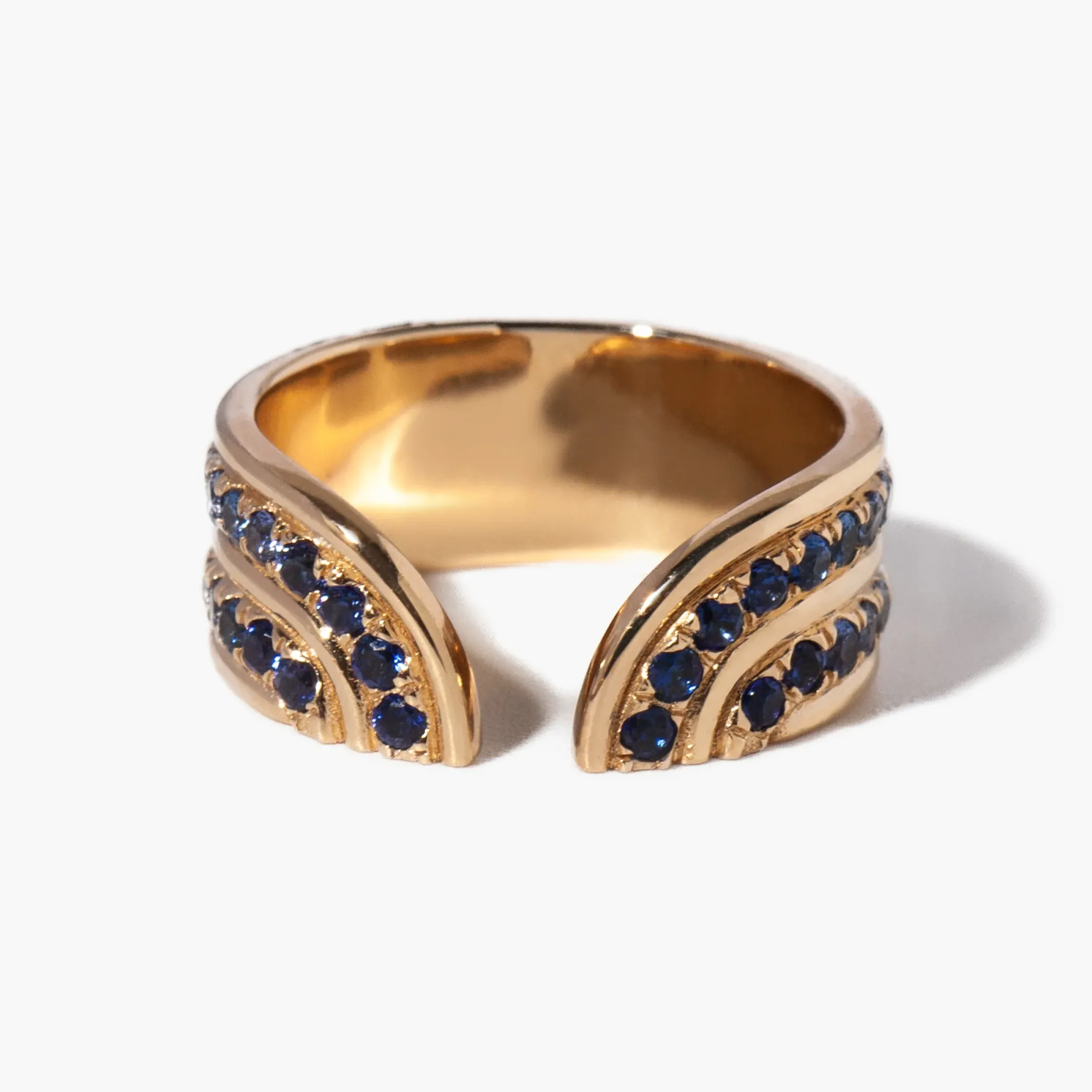 The Stella Ring, designed by Casey Perez, features her signature architectural lines in a modern yet minimal design. Crafted from recycled 14K yellow gold, the sleek band wraps around the finger with an ombre of blue sapphires. It’s perfect for wearing solo or stacked, showcasing Casey’s meticulous attention to detail with four bubbly gold lines. Designed and crafted in Brooklyn, NYC.