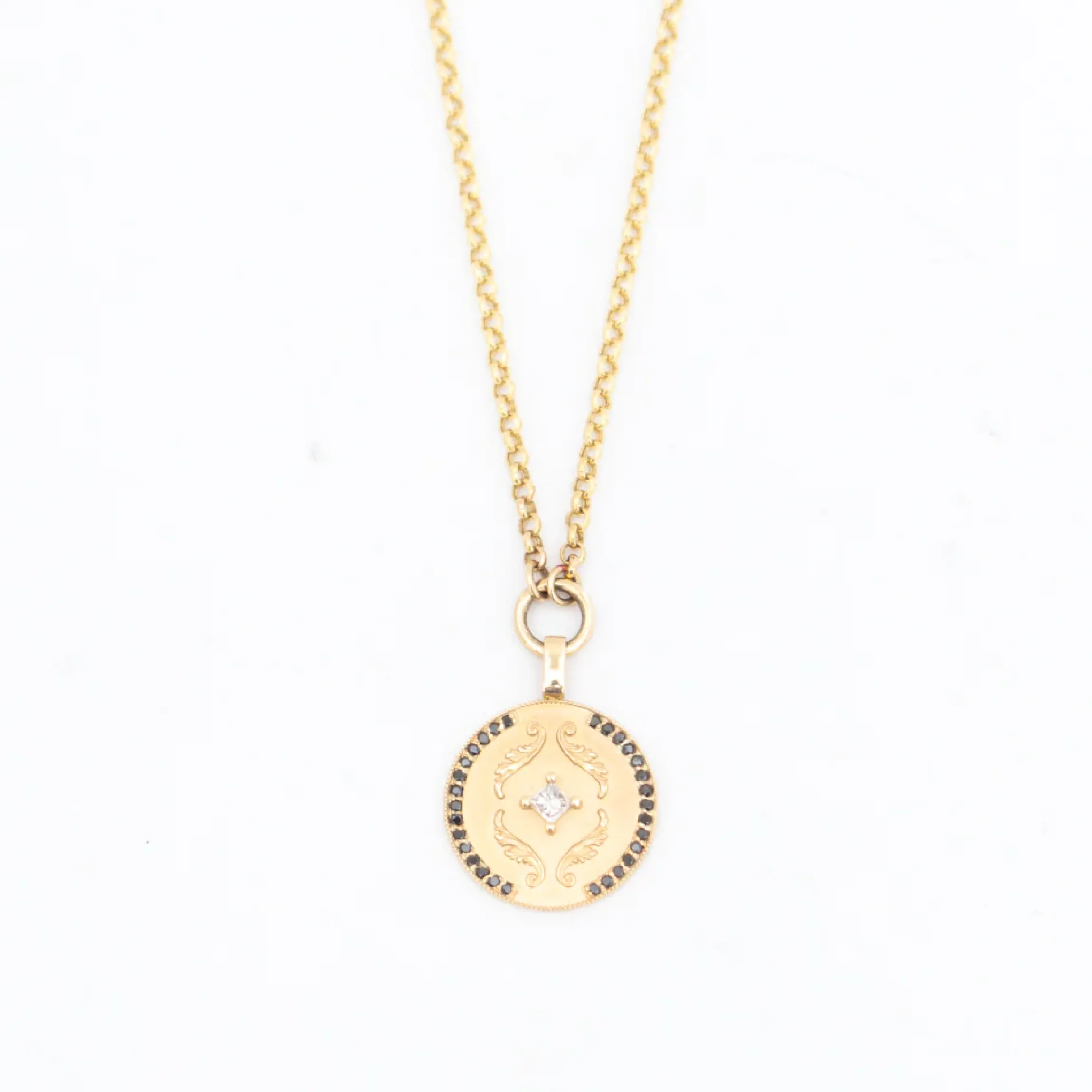 The combination of dark black diamonds and a single white center diamond make this vintage-inspired necklace effortlessly modern. Suspended from a chunky gold ring, the lightly matted coin frames a compass-set princess-cut diamond with curling tendrils drawn from Art Nouveau delicate milgrain on the pendant’s edge. Made in New York.
