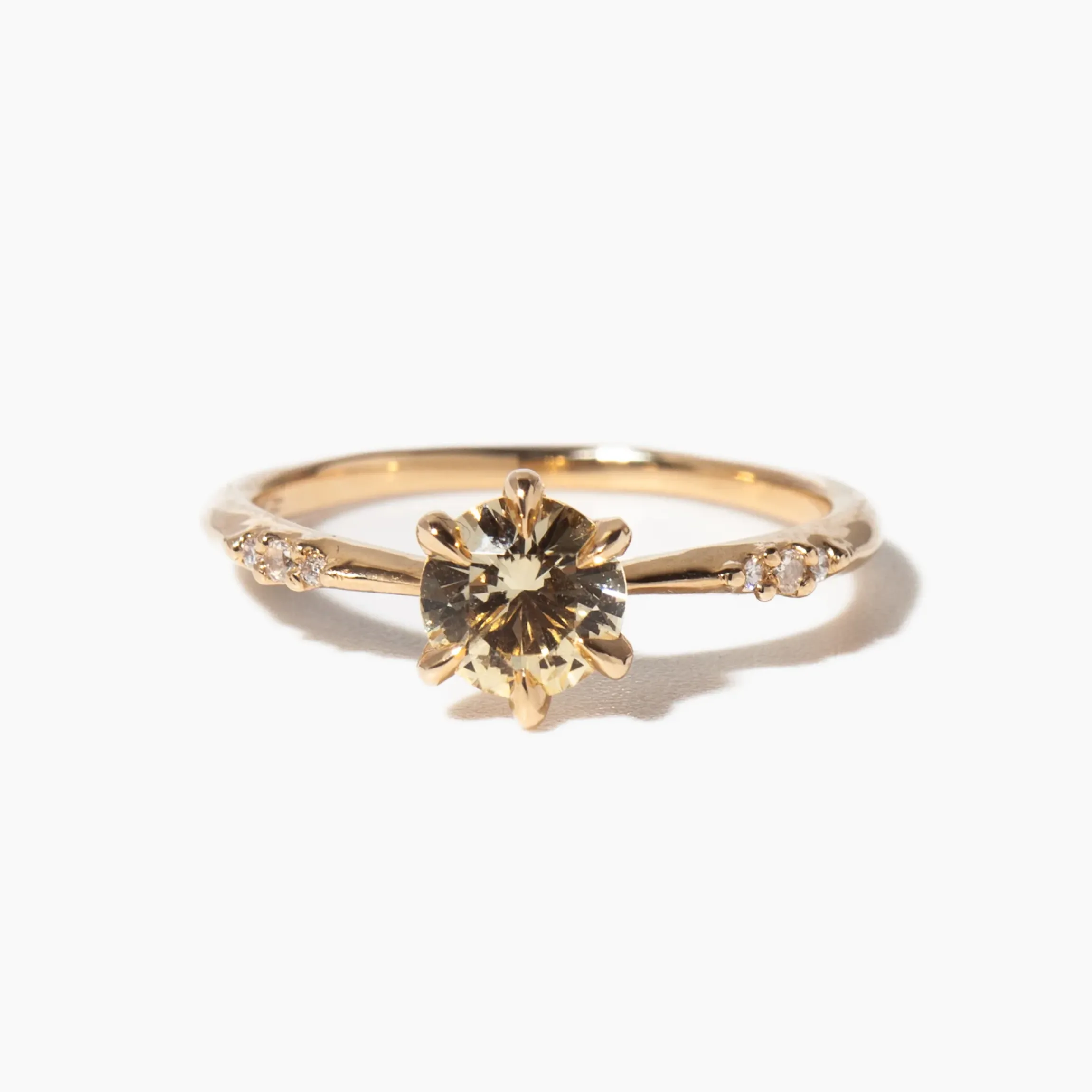 14 karat gold set with approximately one carat heated champagne-yellow sapphire from Ceylon and two 1.25 mm round rose-cut white diamonds, and four 0.9 mm recycled round white diamonds.