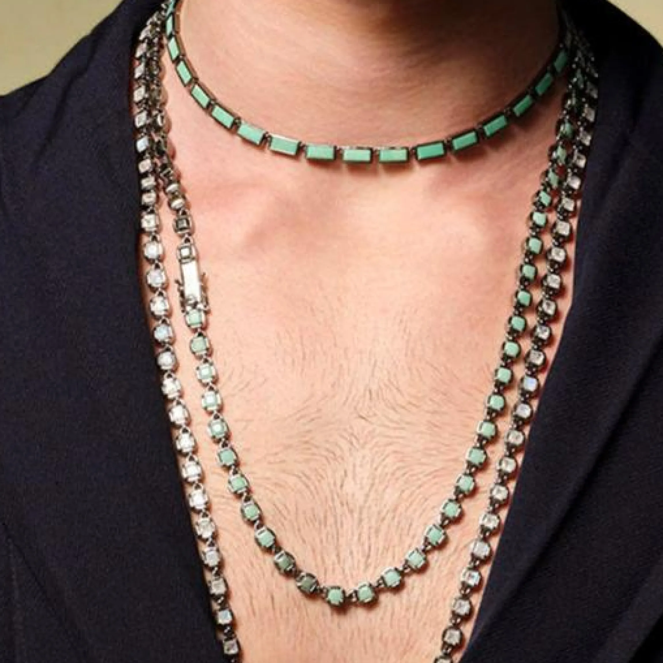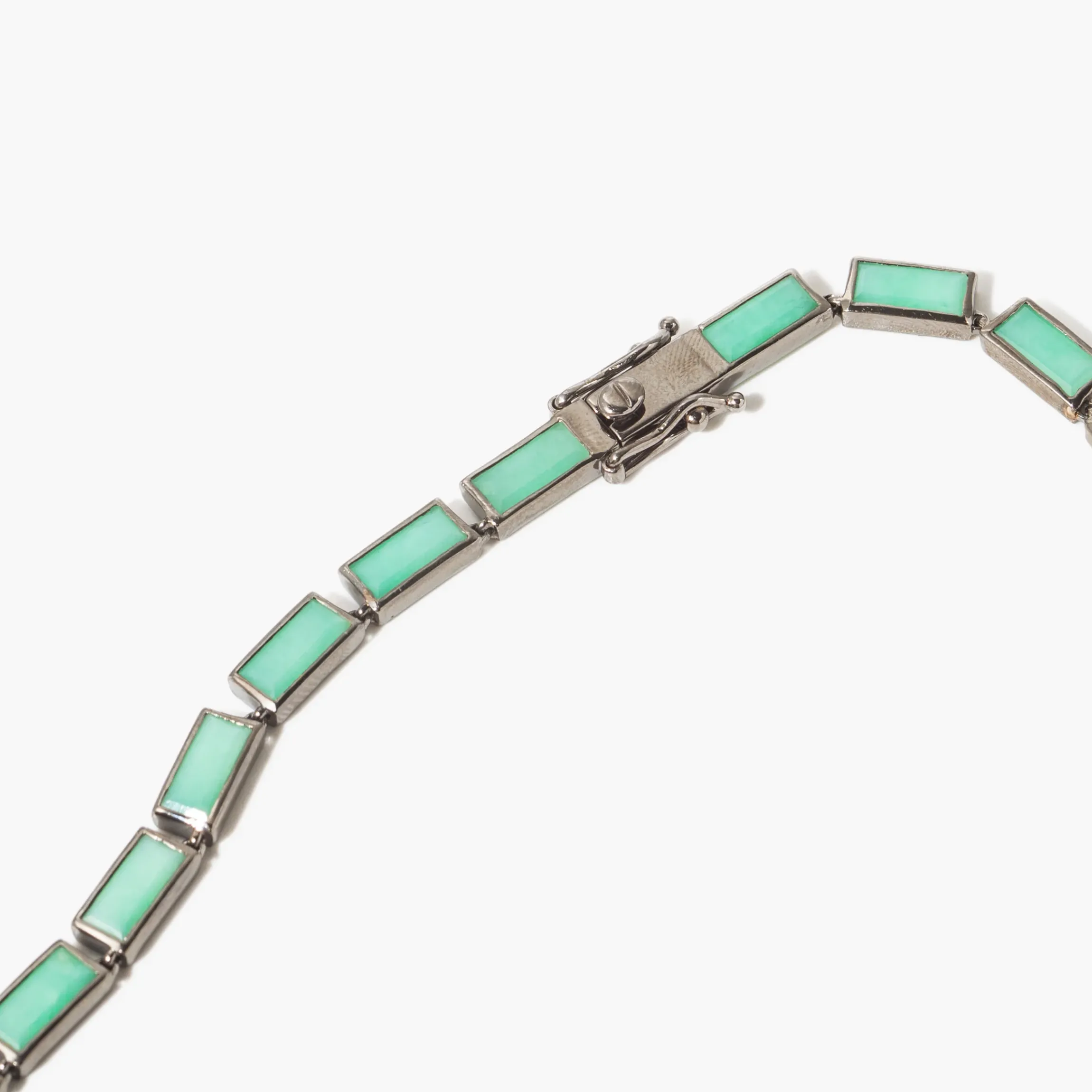 In true Nak Armstrong craftsmanship comes the Chrysoprase Small Linear Baguette Tile Rivière Necklace, an innovative alternative to the traditional tennis necklace. Small rectangular chrysoprase gemstones are set into thick sterling silver covered in black rhodium bezels. Heavy in metal and stones, this is an ideal piece for those who like to express their individual style while simultaneously loving color. Designed in Austin, Texas.
