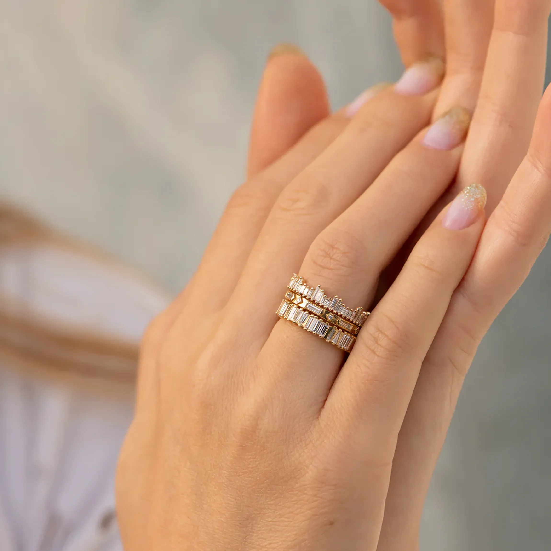 18K yellow gold with an assortment of needle baguette diamonds (VS clarity, color E-G, conflict free) totaling 0.75 carat.