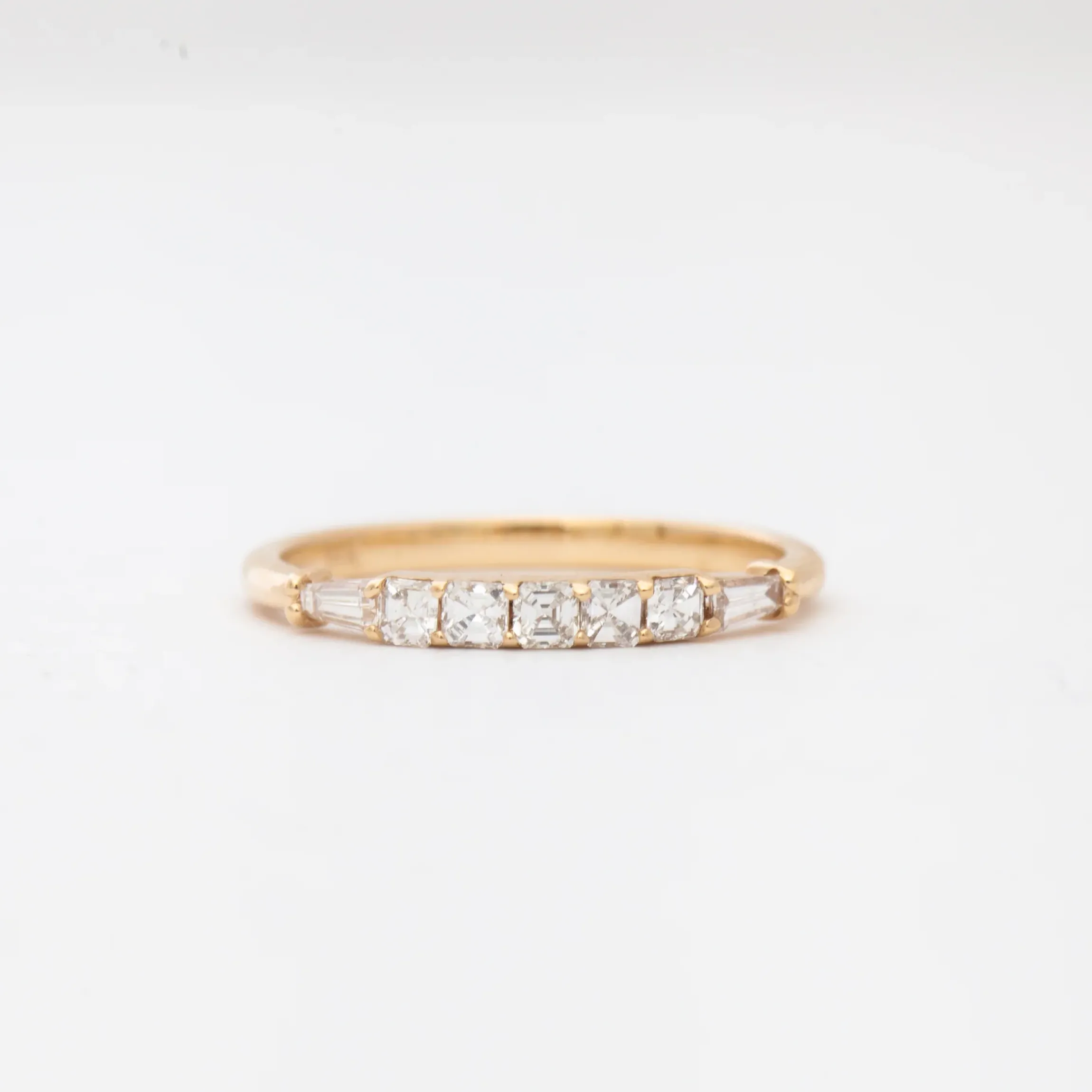 14 karat gold with five asscher cut white diamonds and two tapered baguette white diamonds totaling approximately 0.37 carats (SI1+ clarity, G/H color).