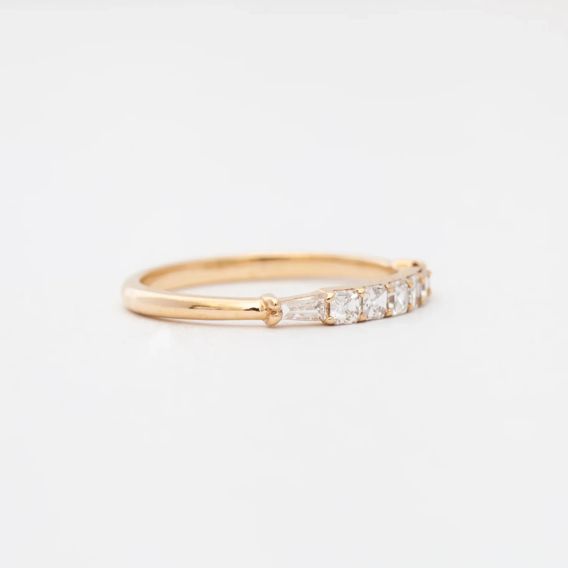 Step back in time with this new band by San Francisco-based Porter Gulch. Featuring a glittering row of asscher cut white diamonds flanked by two tapered baguettes, the Constance is an Art Deco lover’s dream. Pair it with an engagement ring or add it to any ring stack that needs a touch of sparkle. Made in San Francisco.