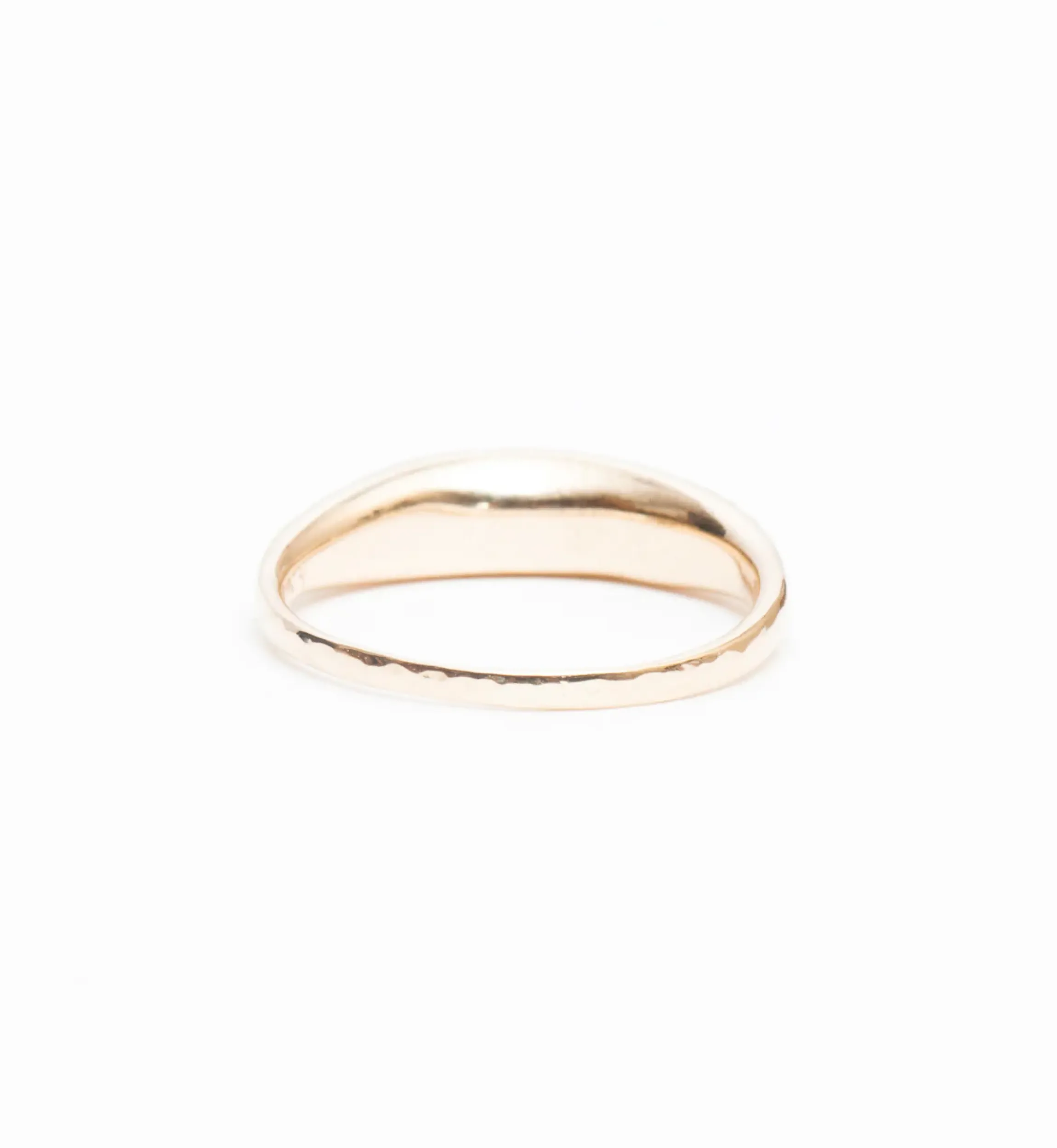 The tapered silhouette of this ring captures the shape of the crescent moon in solid gold. Five white diamonds are flush-set into the metal’s hammered surface, diminishing in side as the ring slims down into a comfortable, skinny band that feels perfectly weighted on the finger. We recommend this ring for anyone who abhors a solitaire or if you want a wedding band with serious substance. Made in the U.S.A.