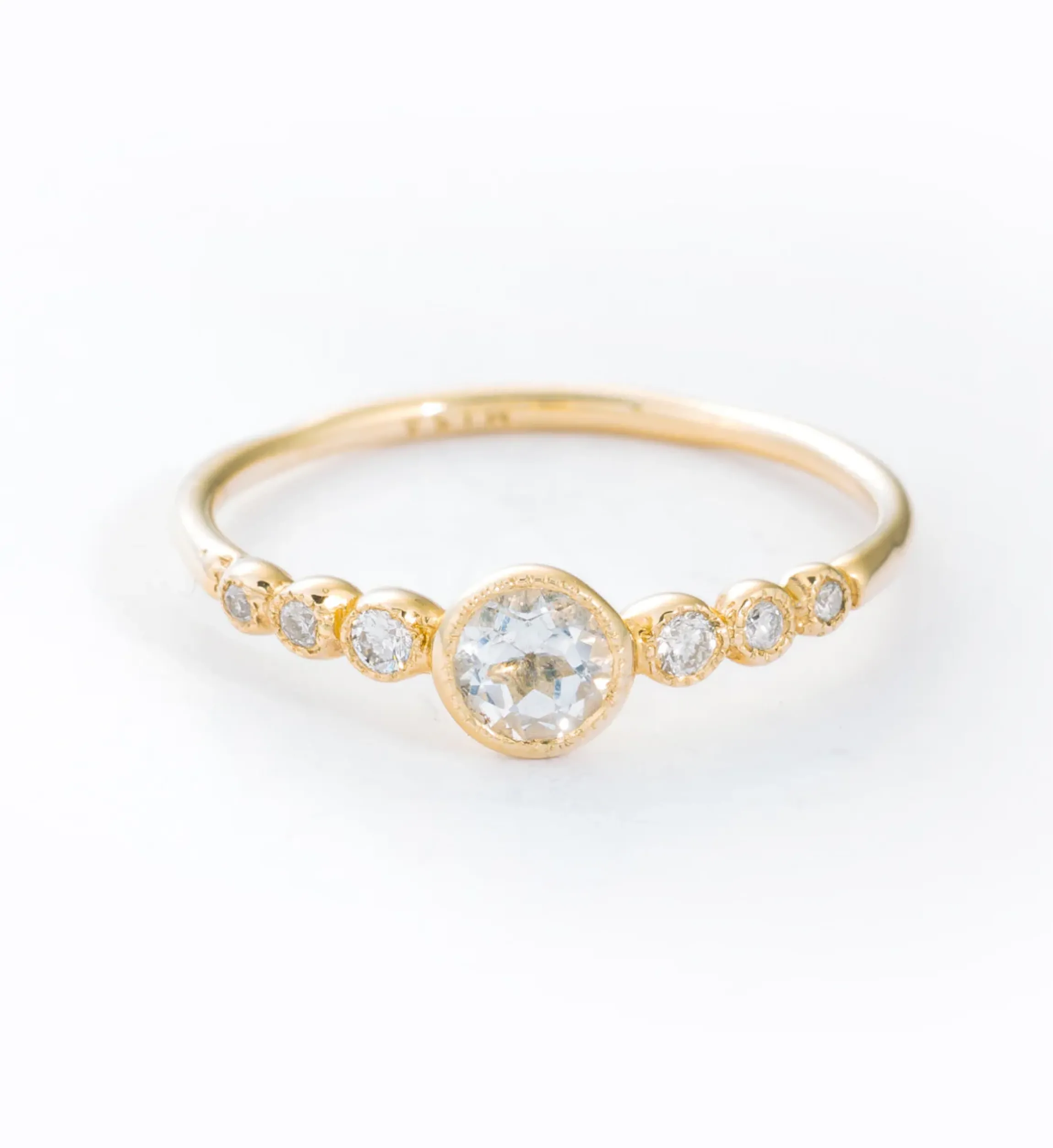 Nature’s own beauty serves as the template for this wonderfully delicate diamond ring. Inspired by the glistening dew of the early morning, seven round brilliant-cut white diamonds are each hand set in matching bezels to create an enchanting mix of stone and metal. The largest diamond is flanked by three smaller stones on each side, descending in size to form a natural, harmonious frame. Minute milgrain detailing traces around the edge of each bezel for a final, painstaking touch. Pair with diamond eternity bands for an overload of gems or a more textured, solid metal style to heighten the contrasts. Made in the U.S.A.