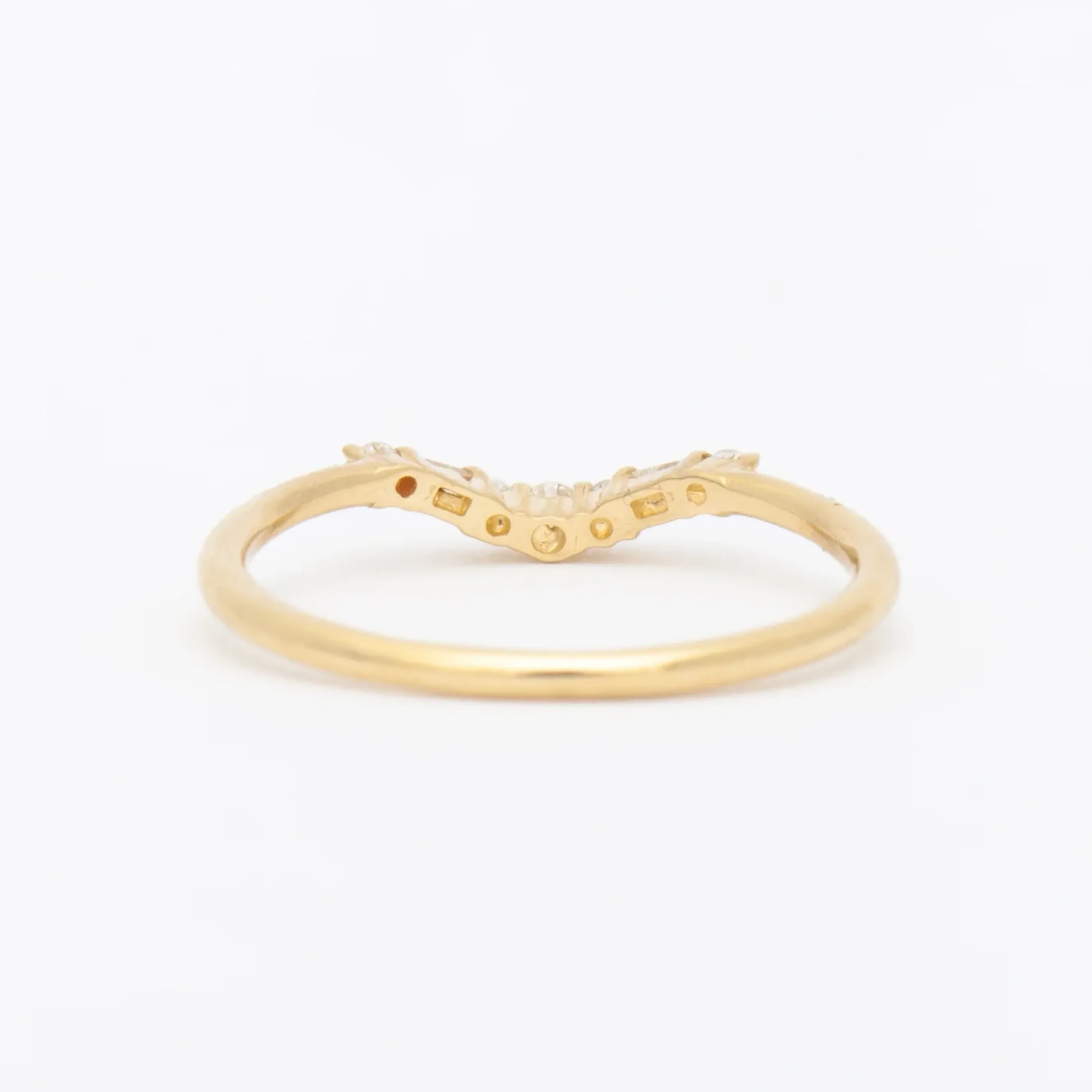 14 karat yellow gold with 1.8 mm round diamonds, two 1.5 mm round diamonds, two 2 x 1.25 mm baguette diamonds, and six 1 mm round diamonds.