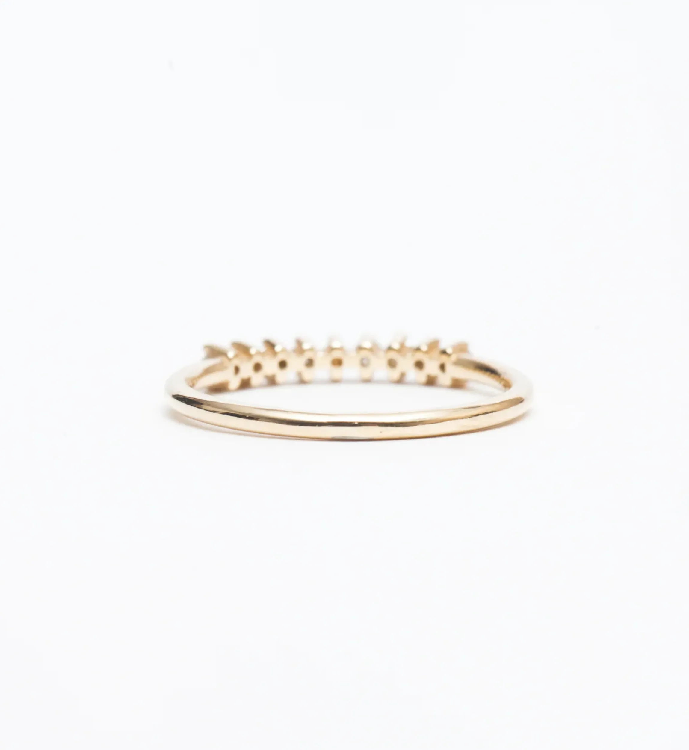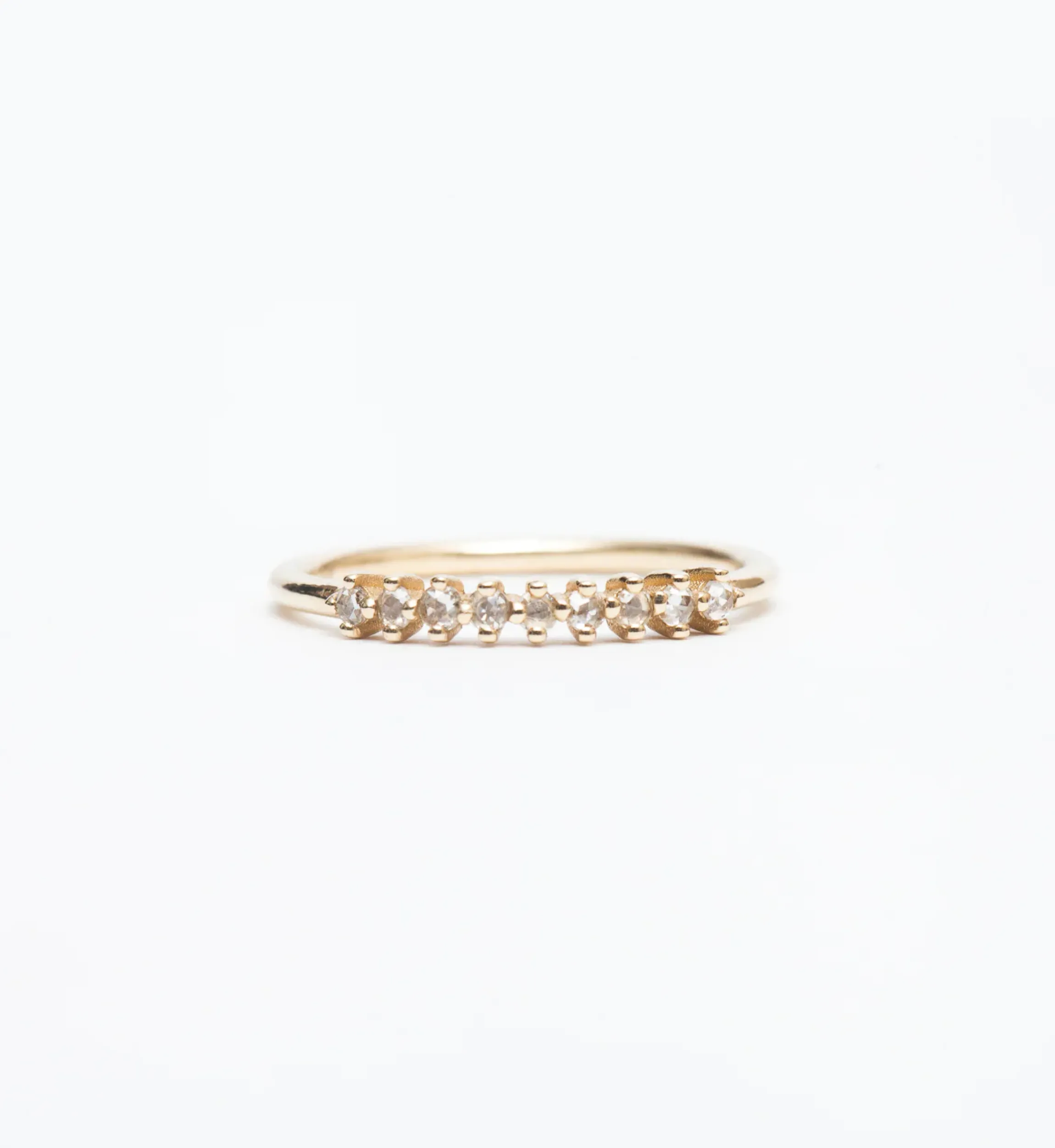 Everything old is made new with this almost half-eternity band of softly shimmering rose-cut diamonds. A row of compass-style, share-prongs makes for an almost seamless setting with tiny beads of gold between each sparkling stone to create a lacy texture along the finger. Stack it with traditional diamond bands for a mesmerizing mix of shine we know you’ll adore. Made in the U.S.A.