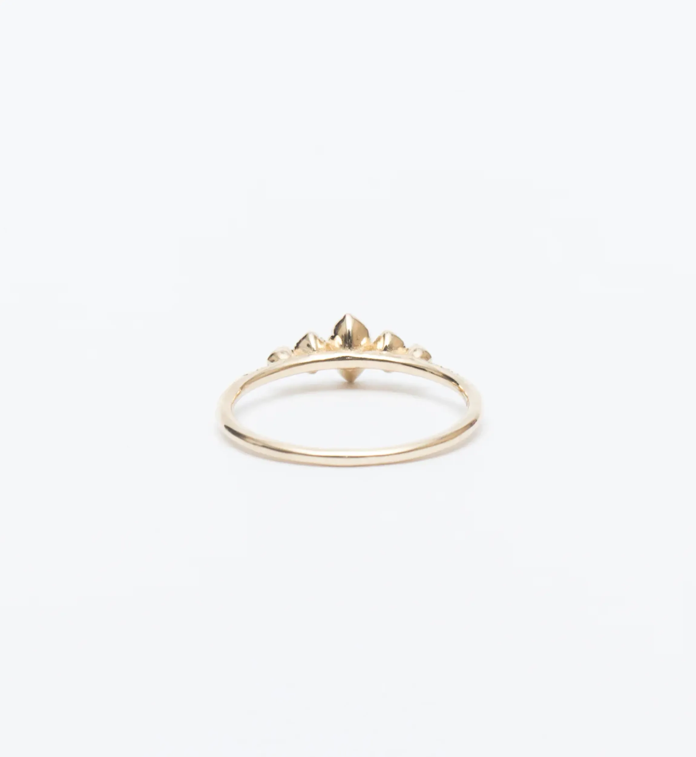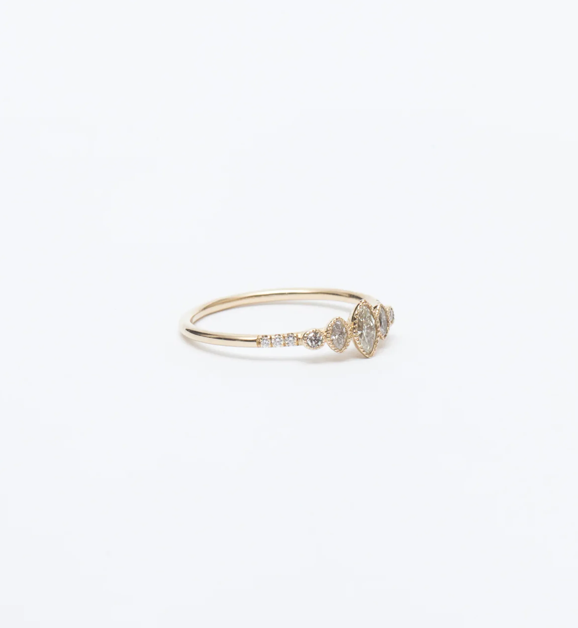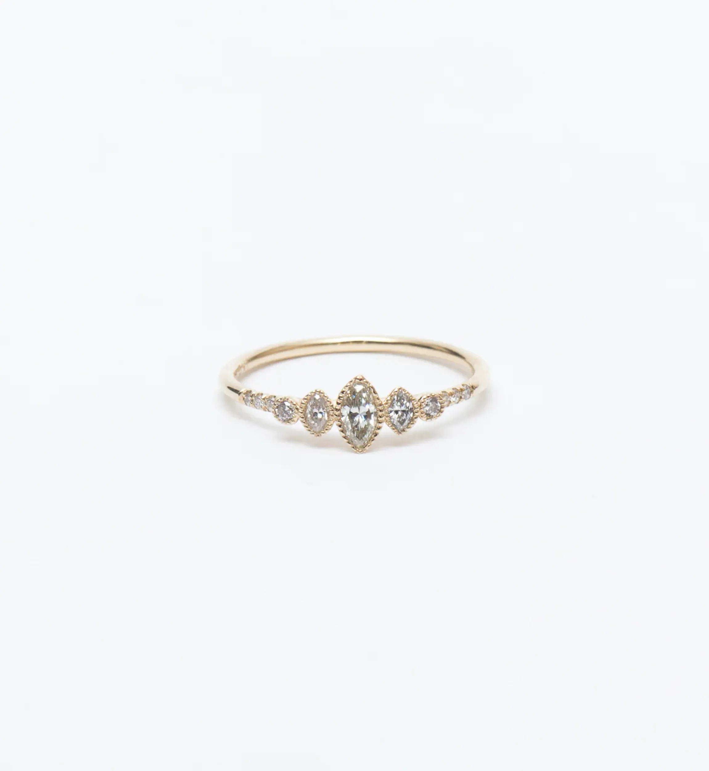 With a trio of marquise diamonds and plenty of round diamond accents, you’ll never be short on sparkle with this dynamic ring. Delicate, hand-finished milgrain beads trace the diamonds’ contours for unforgettable extra sparkle. By carefully combining various shapes and sizes, Jennie Kwon combines vintage inspirations with modern style. Wear it with her minimal bands for striking contrasts. Made in the U.S.A.