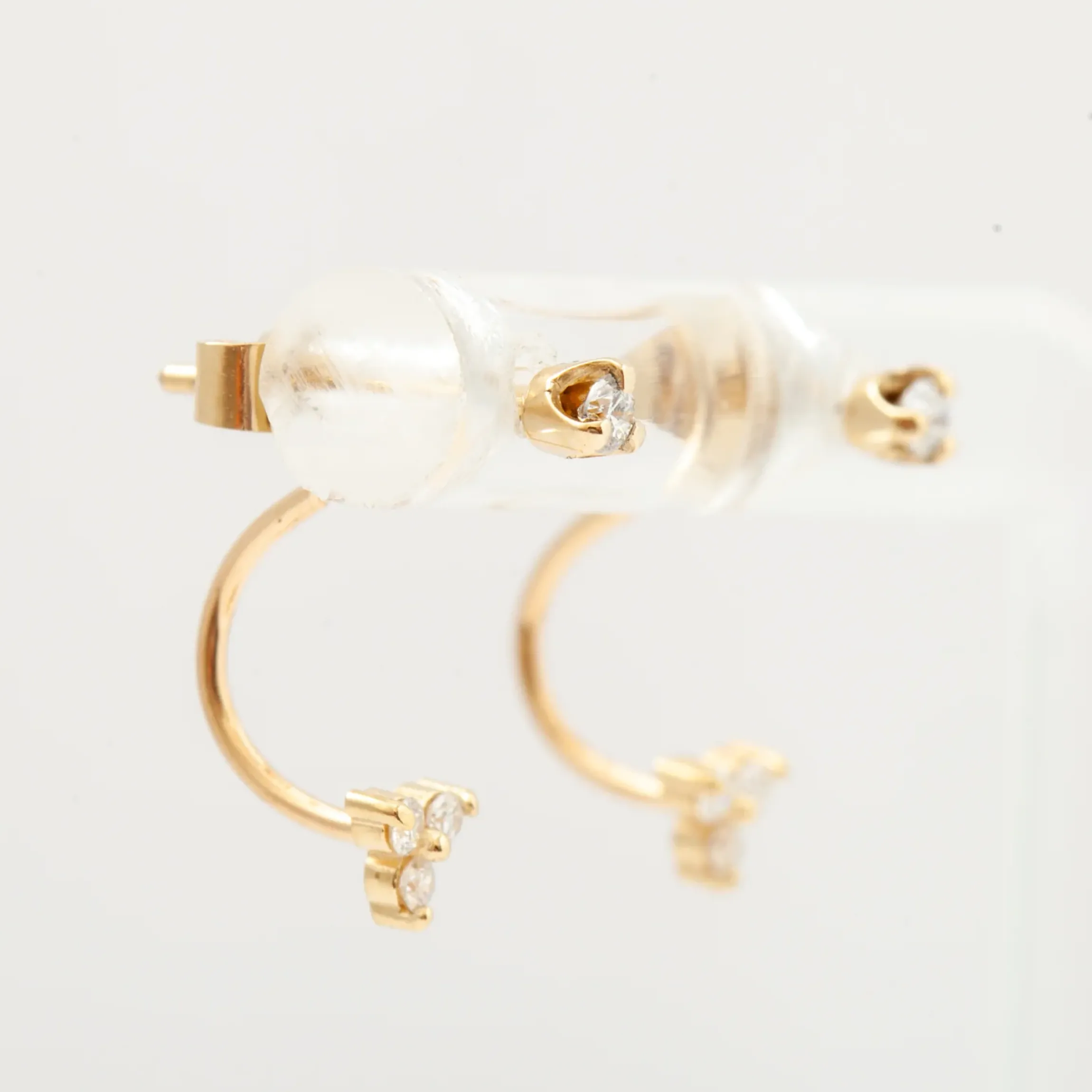 14k yellow gold prong-set 2mm stud earrings with 1.5mm trio prong set stud charms attached to the earring back totaling 0.15 ctw.