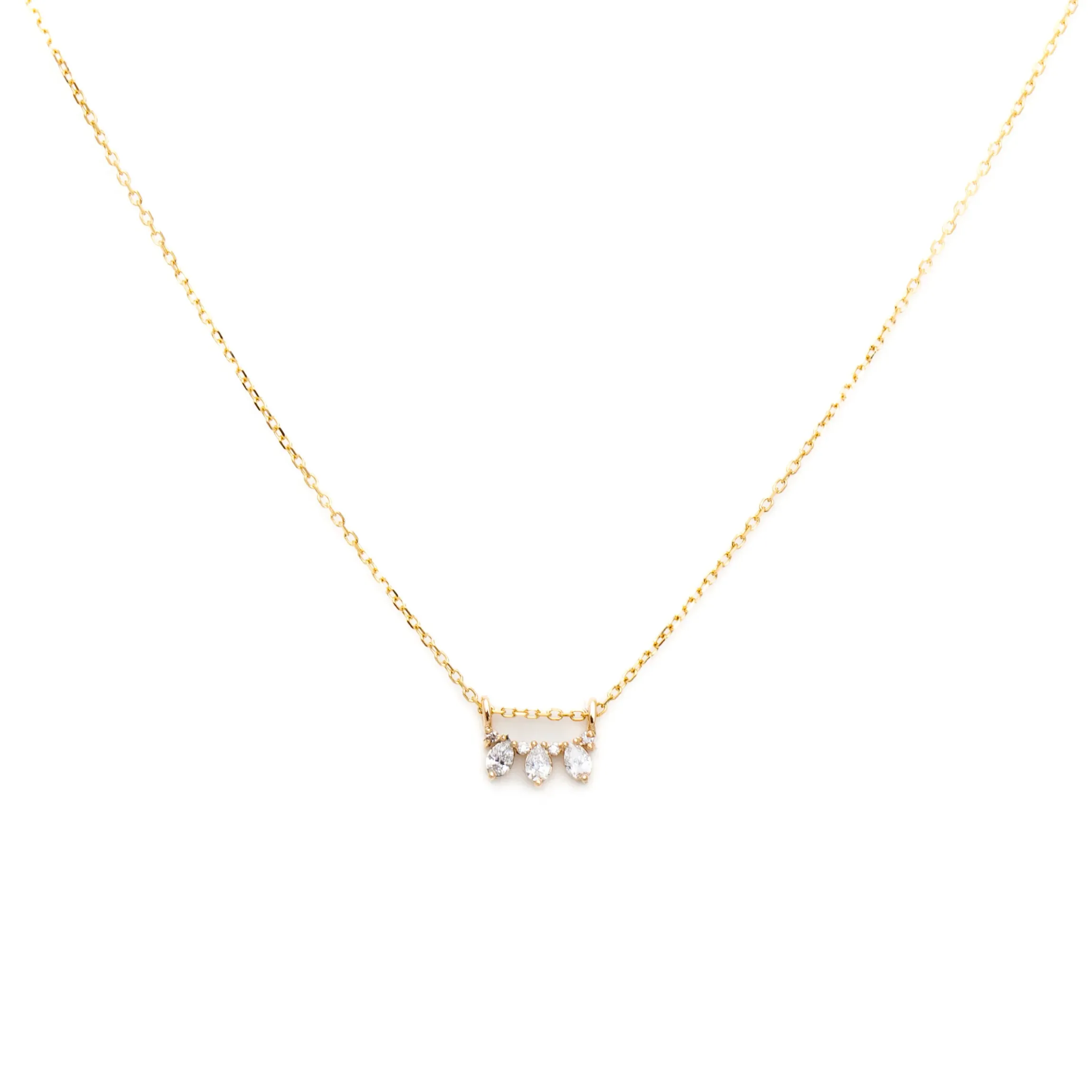 14 karat yellow gold with <span data-sheets-root="1" data-sheets-value='{"1":2,"2":"Our Diamond Waltz Necklace sits gracefully on the decollete, and catches the eye with a unique mix of tiny pear and round diamonds.