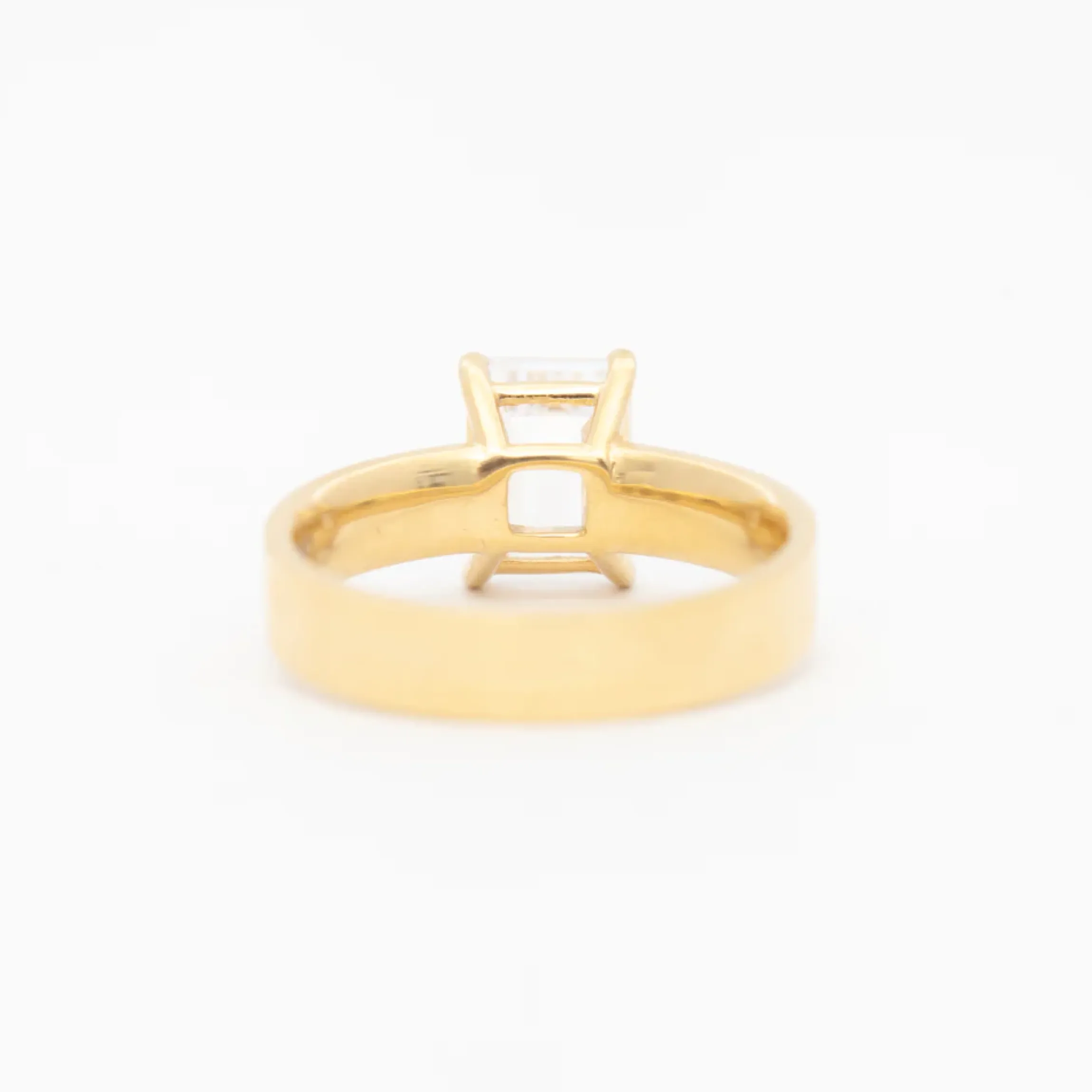 18 karat yellow gold set with a 1.75 carat emerald-cut G-H VS white diamond.