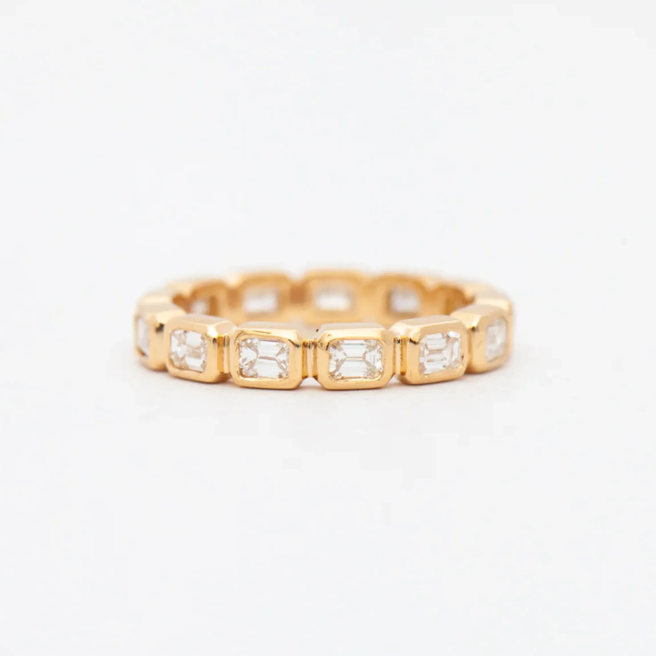 Who says a wedding band can’t make a statement? This bezel-set eternity band by The Future Fine is a multi-faceted dream come true. Glittering emerald-cut white diamonds catch the light from every angle, each wrapped in a luxurious layer of gold. Pair this band with a simple solitaire engagement ring to add a punch of pattern to your stack. Made in the U.S.A.