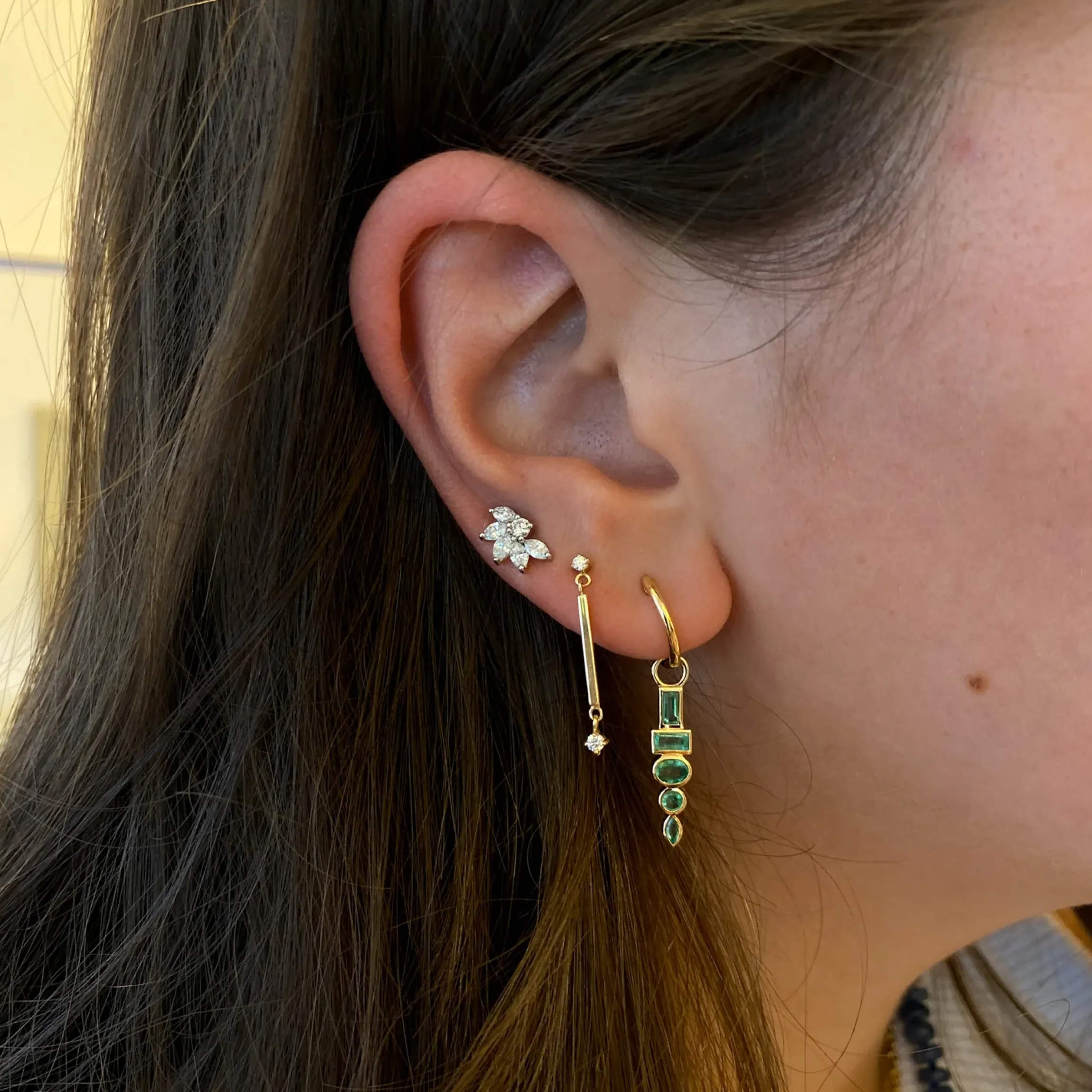 Our best-selling Diamond Totem Earrings by New York-based Sorellina just got a new look with a delicate stacking of gold-wrapped emeralds that flow seamlessly from one to the other. Wear them low on the year as a statement piece that accentuates any look, or move them higher up the lobe for an ear stack that will turn heads.