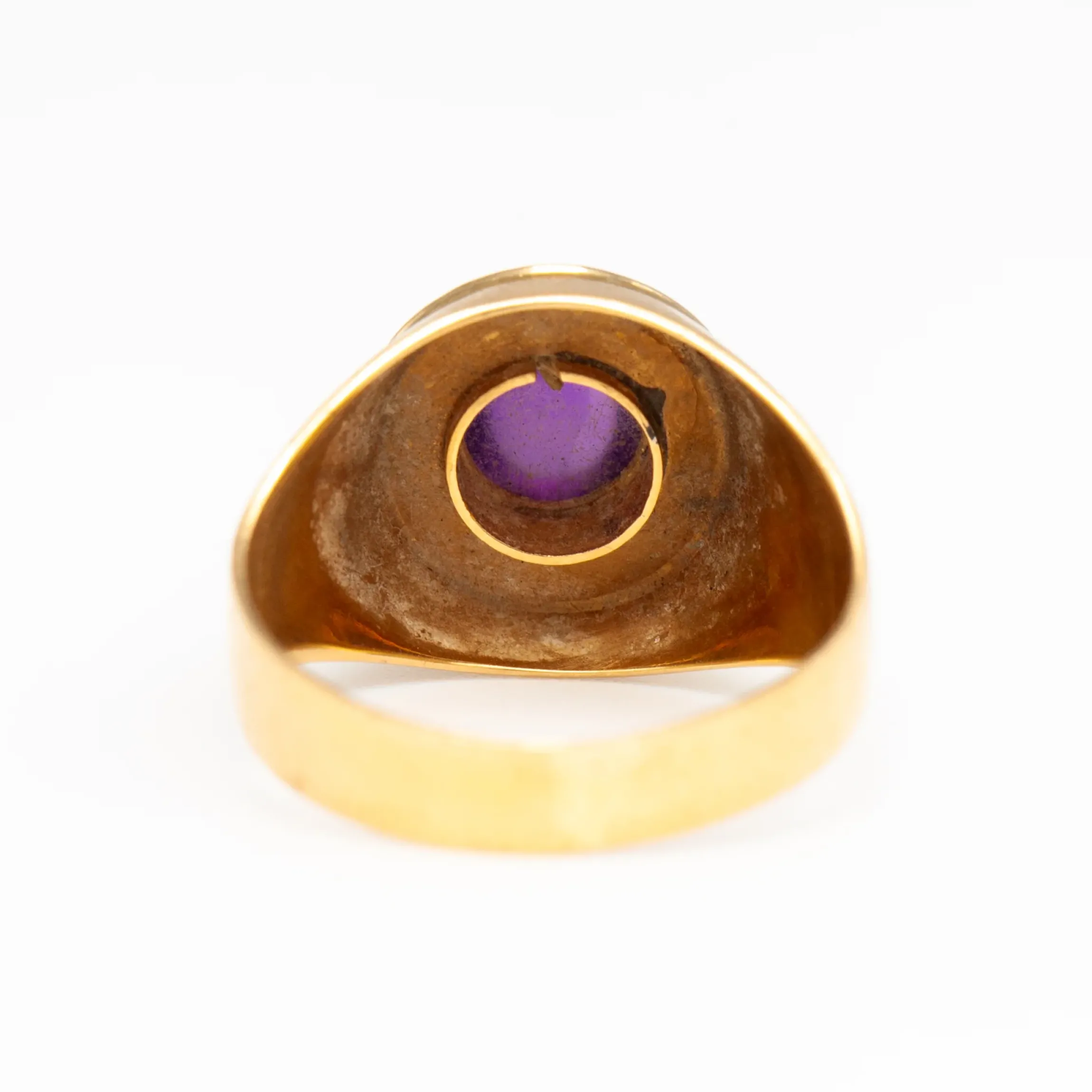 Add a pop of punchy purple to your ensemble with this 1965 Finnish Amethyst u0026amp; Seed Pearl Cocktail Ring. The striking center amethyst stone is elegantly framed by a halo of delicate pearls, bringing a touch of vintage charm to your look. This unique cocktail ring is perfect for those looking to add a piece of 60s history to their jewelry collection.