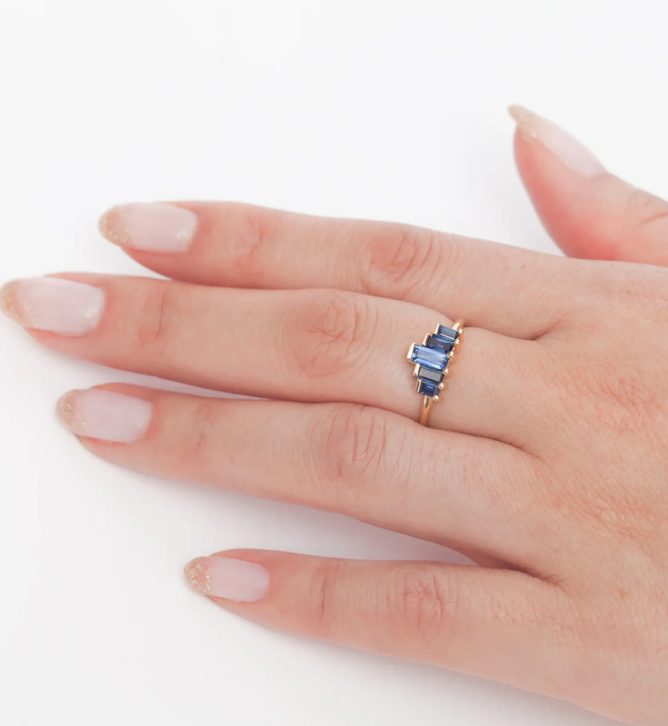 Designers Tanya and Tomer revisit their beloved Art Deco inspirations with a streamlined design perfect for the woman who craves color. A set of five blue sapphires are carefully composed into a miniature piece of architecture with flat half bezels and delicate round beads framing their shimmering facets. Wear it with a simple band to fuse classic and modern. Made in Israel.