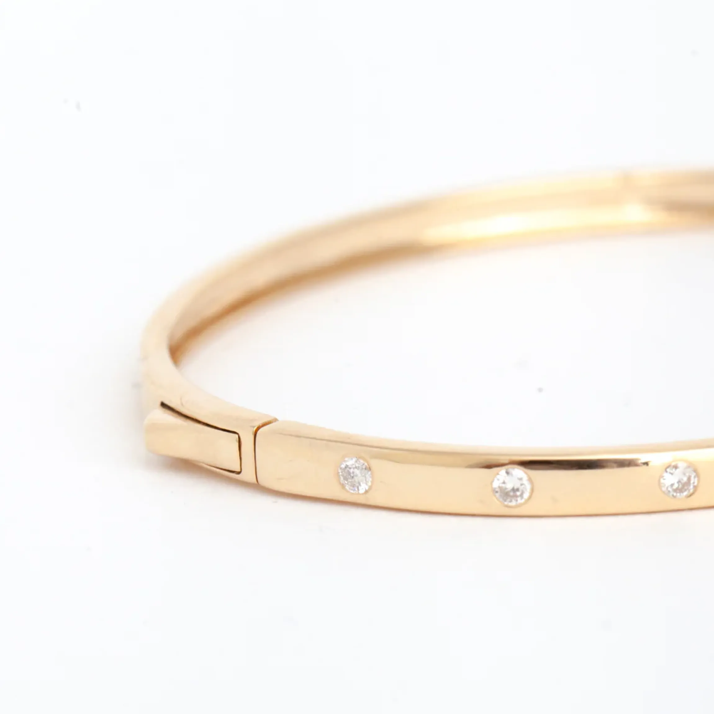 This gold bangle looks sharp on its own, plays nice with all varieties of chain, and brings all the sparkle with flush-set round white diamonds—what more could you want from an essential piece of jewelry? A barely noticeable closure offers secure, fuss-free wear so you’ll never think twice about leaving it on all day.