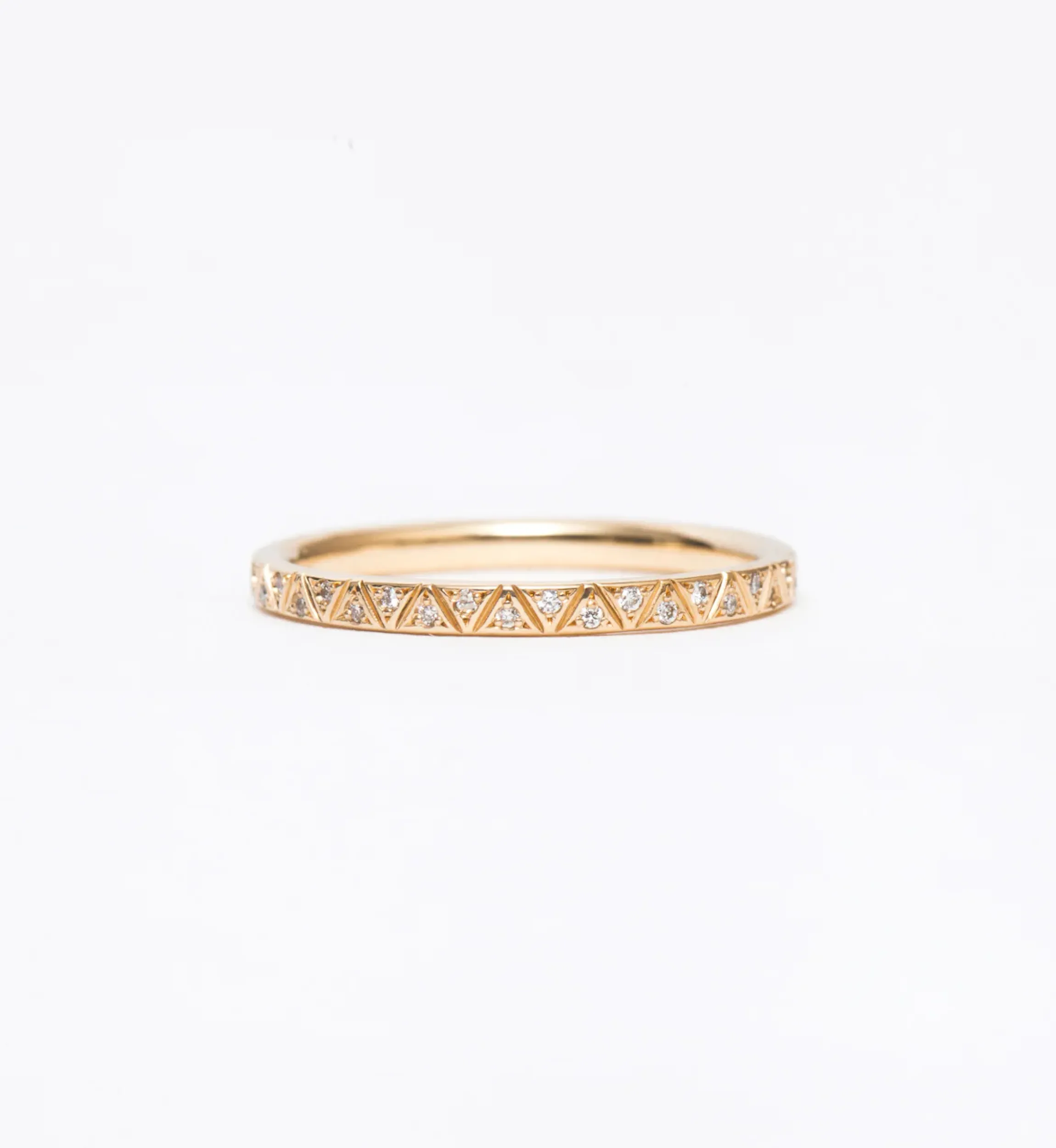 The elegant eternity band takes a turn for the unexpected with the geometric motif and offset diamond detailing that give this piece its unmistakable look and feel. Whether worn as a wedding band or stacked alongside other pieces, this ring’s subtle approach to texture and sparkle makes it a welcome addition. Style it in different metal colors on one finger for a streamlined, but no less intriguing, look. Made in Israel.