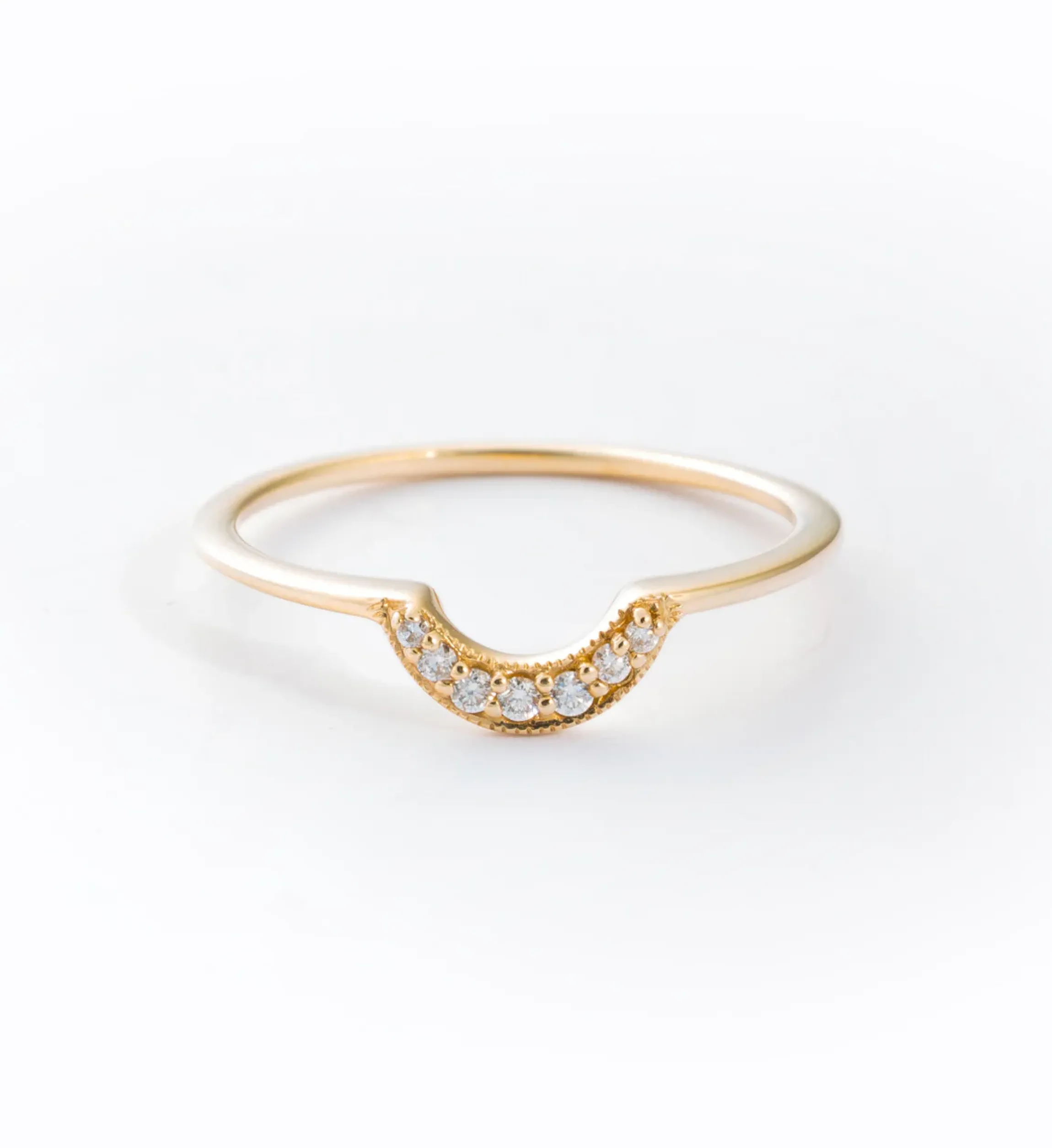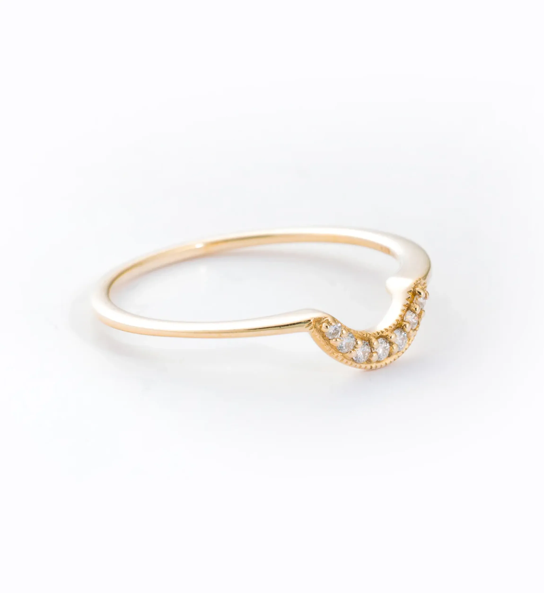 It’s hard to beat a classic combination like gorgeous white diamonds set into pure 14 karat yellow gold, but Anna Sheffield throws a literal curve at you, resulting in a delicate crescent of gold. A pavé of seven white diamonds blaze from the gold setting while the gentle semi-circular shape fits perfectly around any number of Anna Sheffield’s other rings to let you mix-and-match to your heart’s content. Designed in New York.