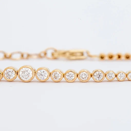 Go big or go home with this graduated tennis bracelet that features bezel-set diamonds from one end to the other. Gorgeous alone and even better stacked with a variety of chains, this bracelet will surprise you with its subtle elegance making it perfect for everyday wear. Finished with a lobster clasp closure.