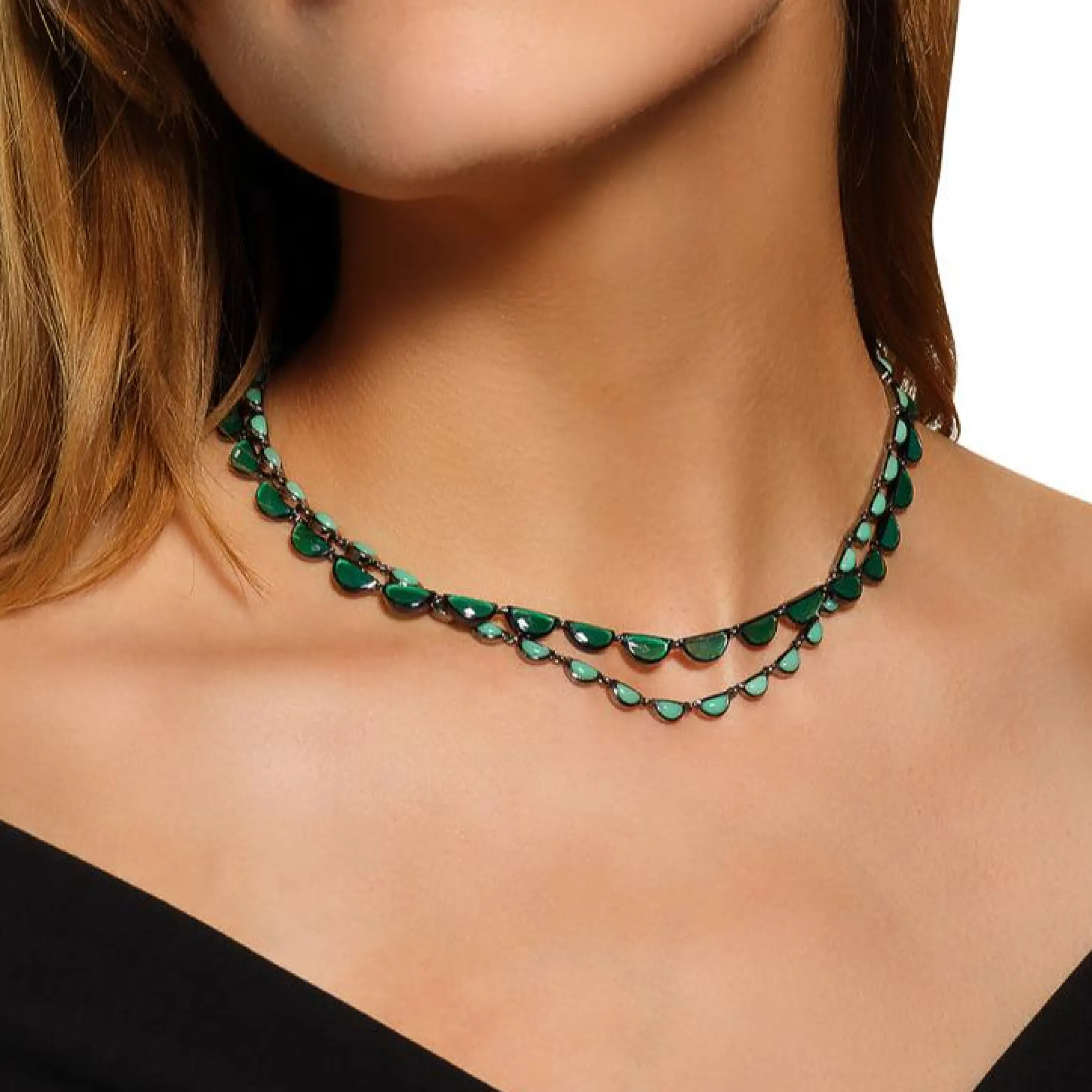 In true Nak Armstrong craftsmanship comes the Green Onyx Large Scallop Rivière Necklace, an innovative alternative to the traditional tennis necklace. Small crescent moon green onyx gemstones are set into thick sterling silver covered in blue rhodium bezels. Heavy in metal and stones, this is an ideal piece for those who like to express their individual style while simultaneously loving color. Designed in Austin, Texas.