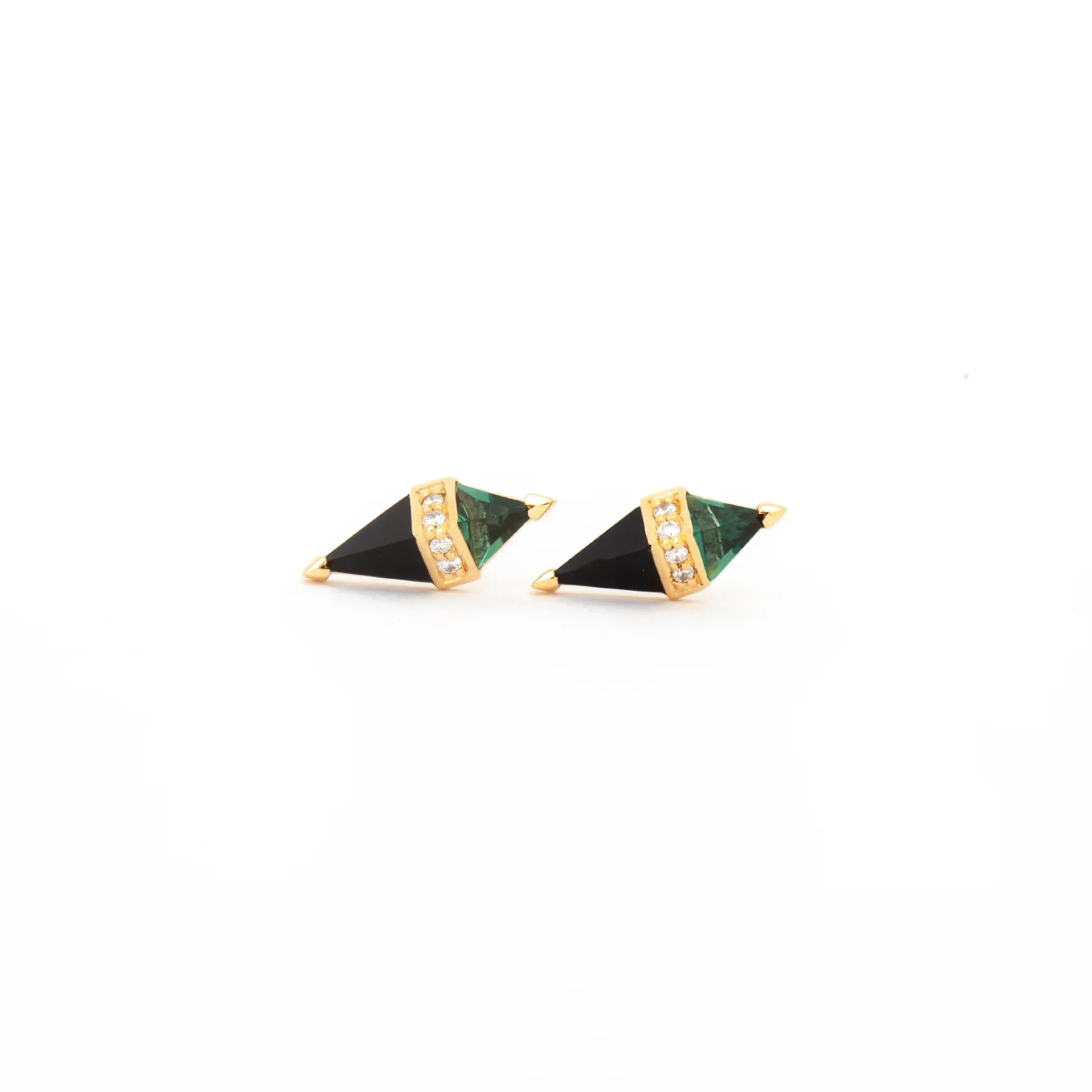 18K yellow gold stud earrings with green quartz, black onyx, and white diamonds (G-H color/SI clarity) totaling 0.04 ct.