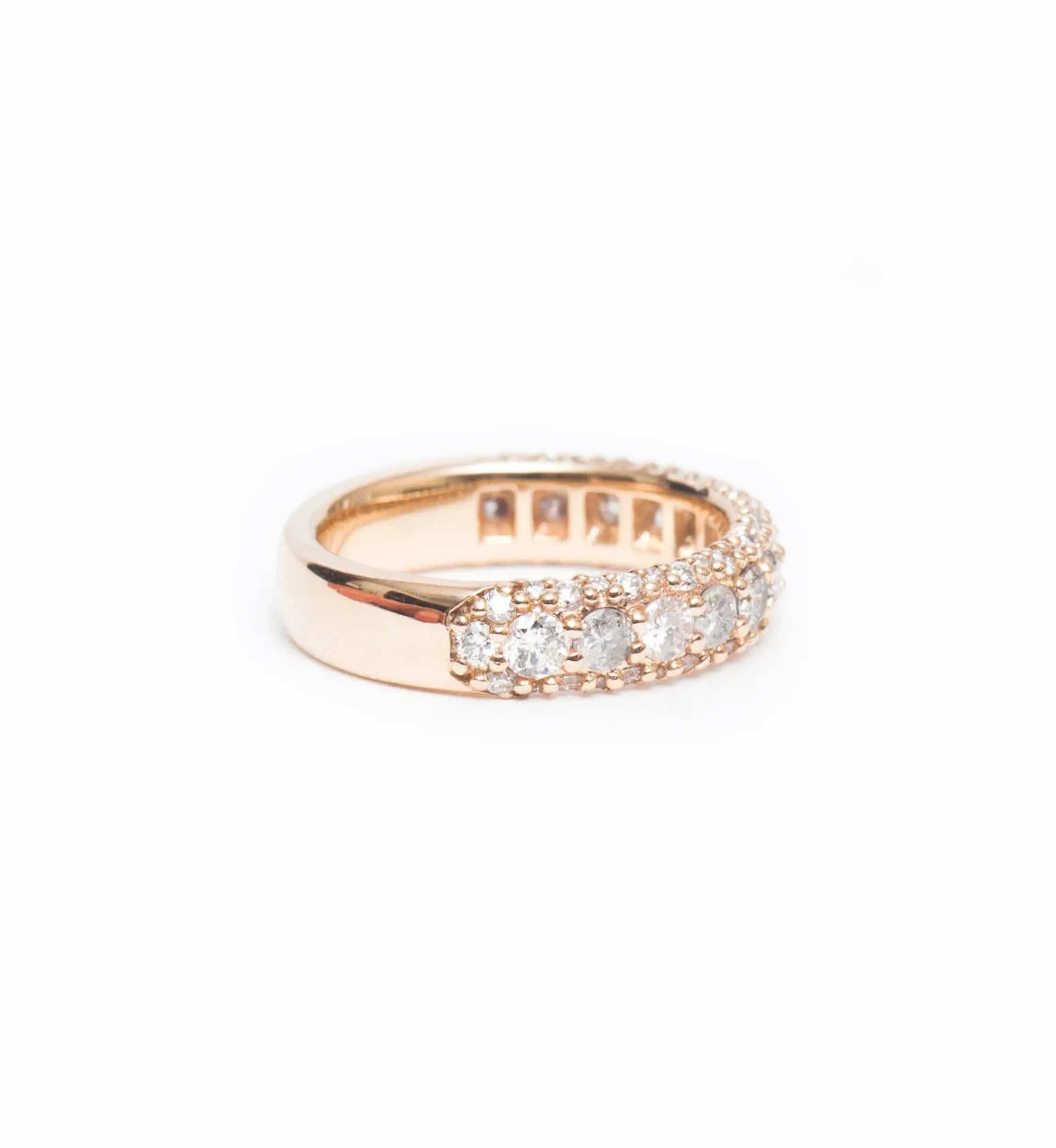 A frame of white diamonds outlines the central pavé of grey diamonds on this absolutely stunning band. Bright yellow gold lets the alternating bands of white and grey gemstones come to life, with equally brilliant settings in contrasting colors. The carefully set diamonds guarantee that the band will catch the light perfectly at any angle. Pair it with one of Anna Sheffield’s signature solitaire rings for an unbelievable duo of diamonds. Designed in New York.