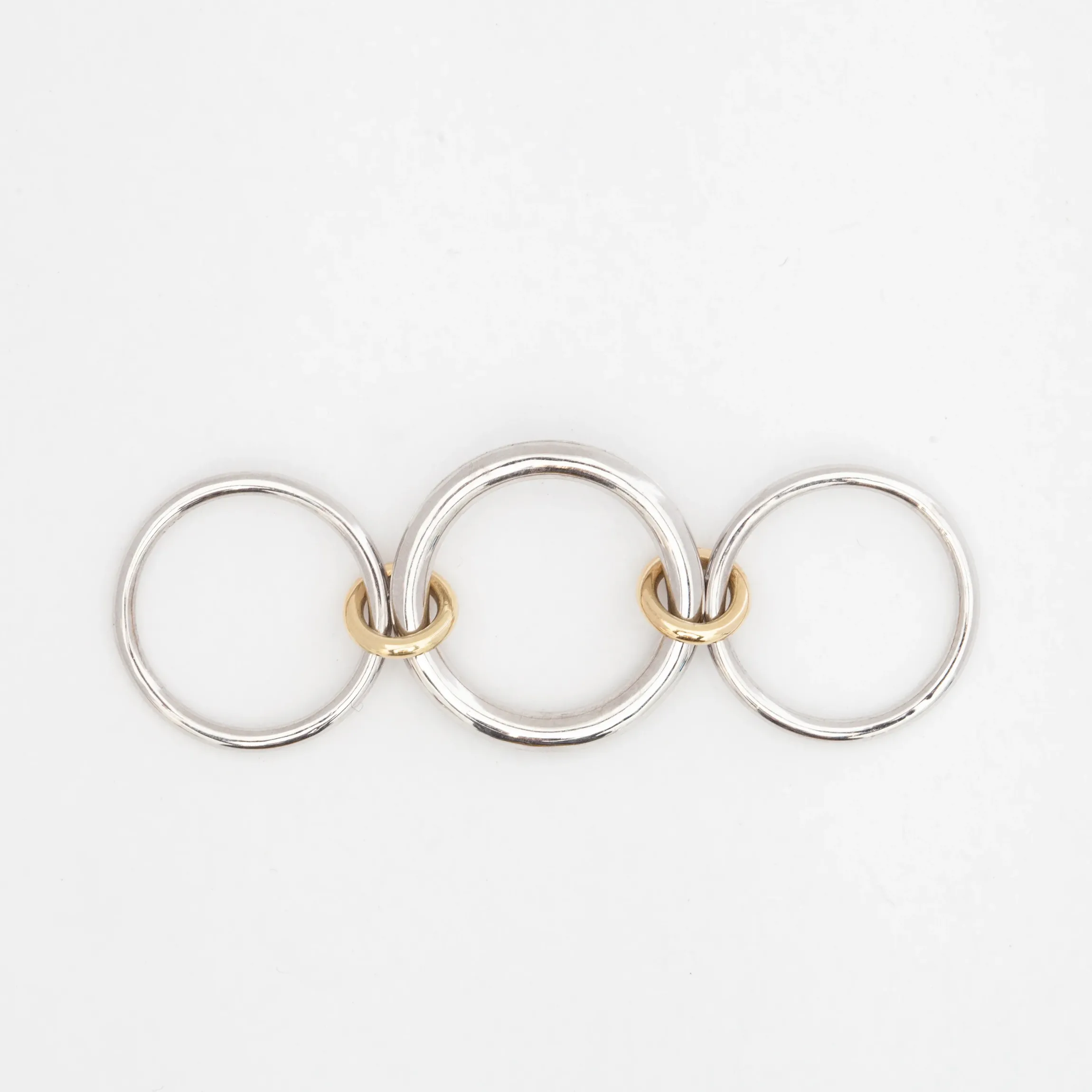 Light flows around the finger with channel-set baguette diamonds that are tucked into the center of this triple-banded design. A pair of yellow gold bands create rich contrast, making the white diamonds blend seamlessly into their white gold setting. Slender, yet substantial, this piece features Spinelli Kilcollin’s signature connector construction so you can wear it as a stack or spread it across your fingers. Made in the U.S.A.