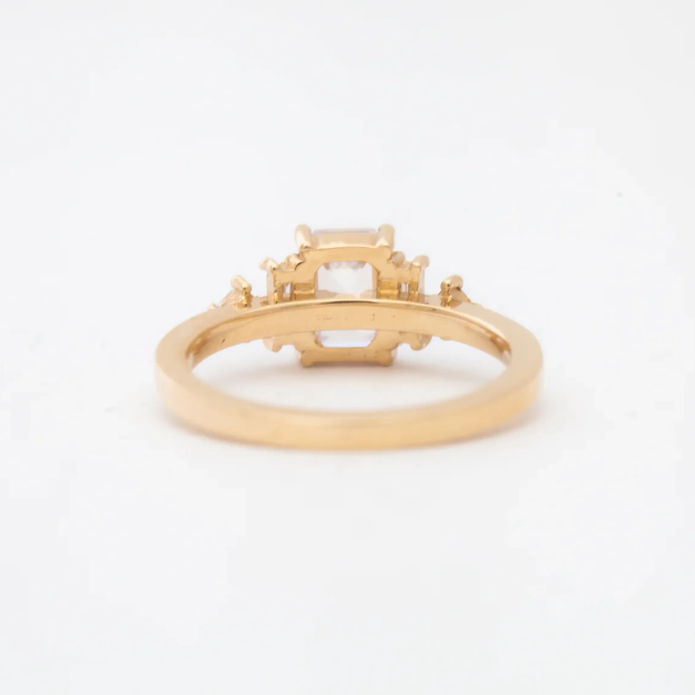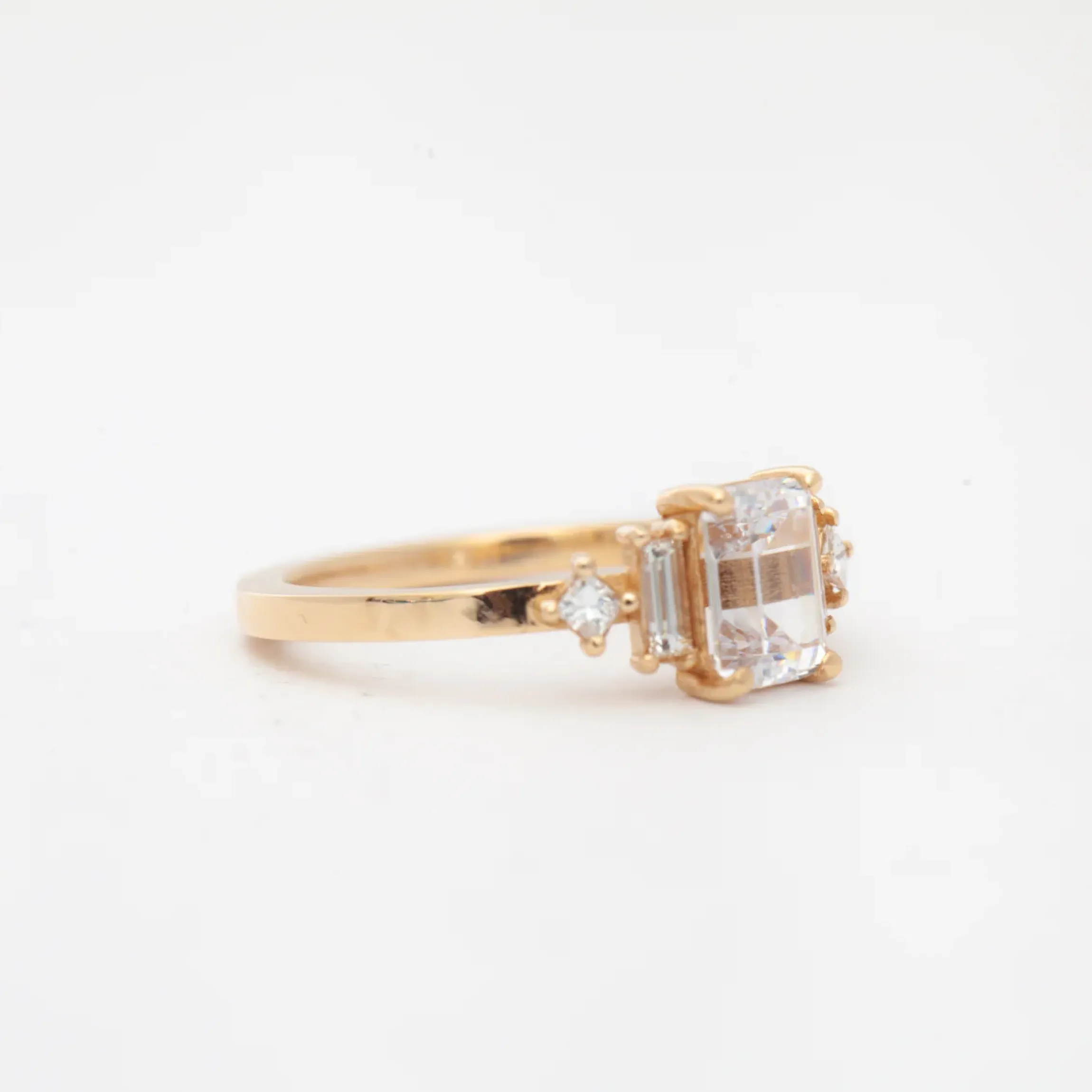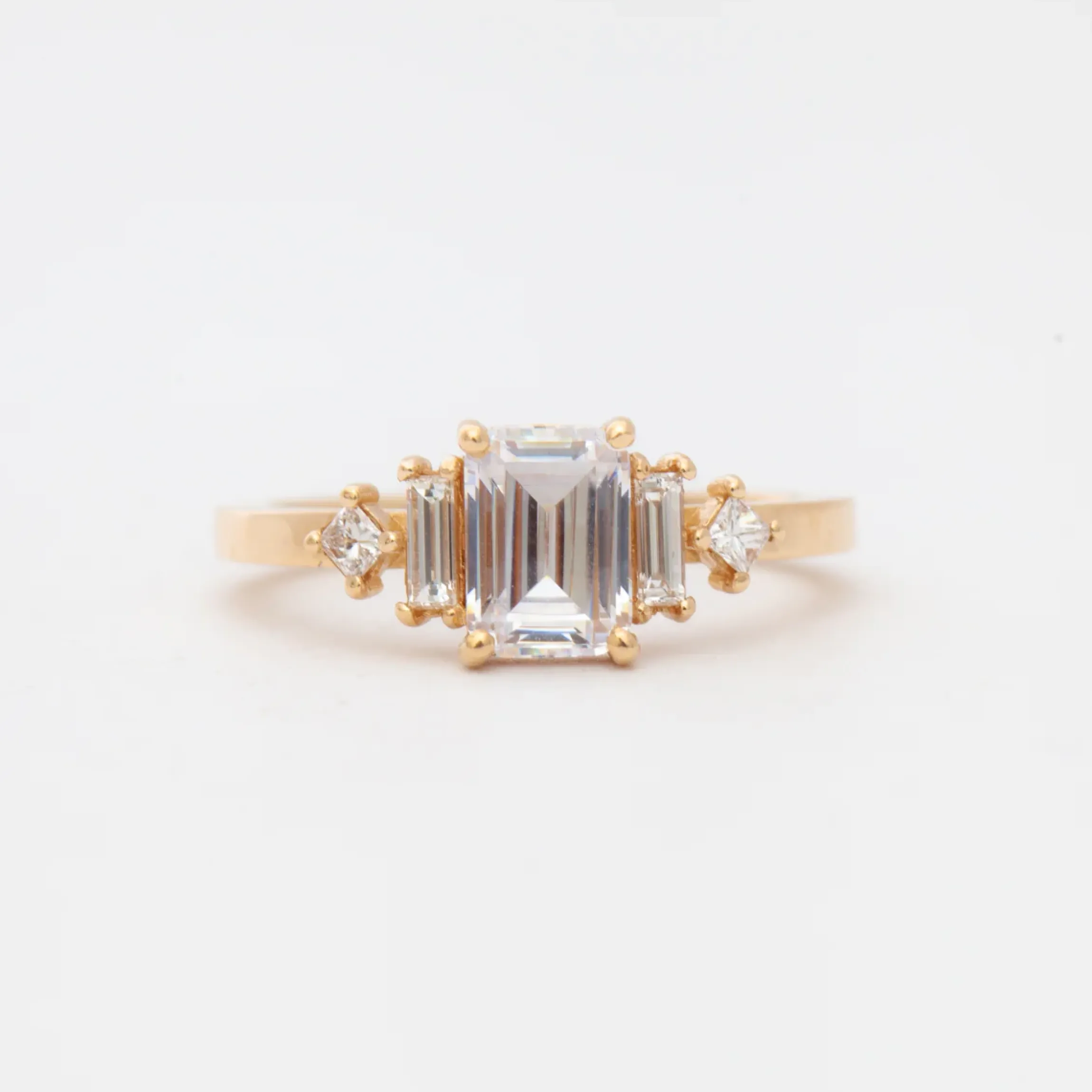 Emerald-cut lovers will fall head over heels over this vintage-inspired classic by Porter Gulch. With two slim baguettes flanking a hand-selected white diamond center and an additional pair of princess-cut diamonds, this ring is as elegant as they come. Designed and made in San Francisco, CA.