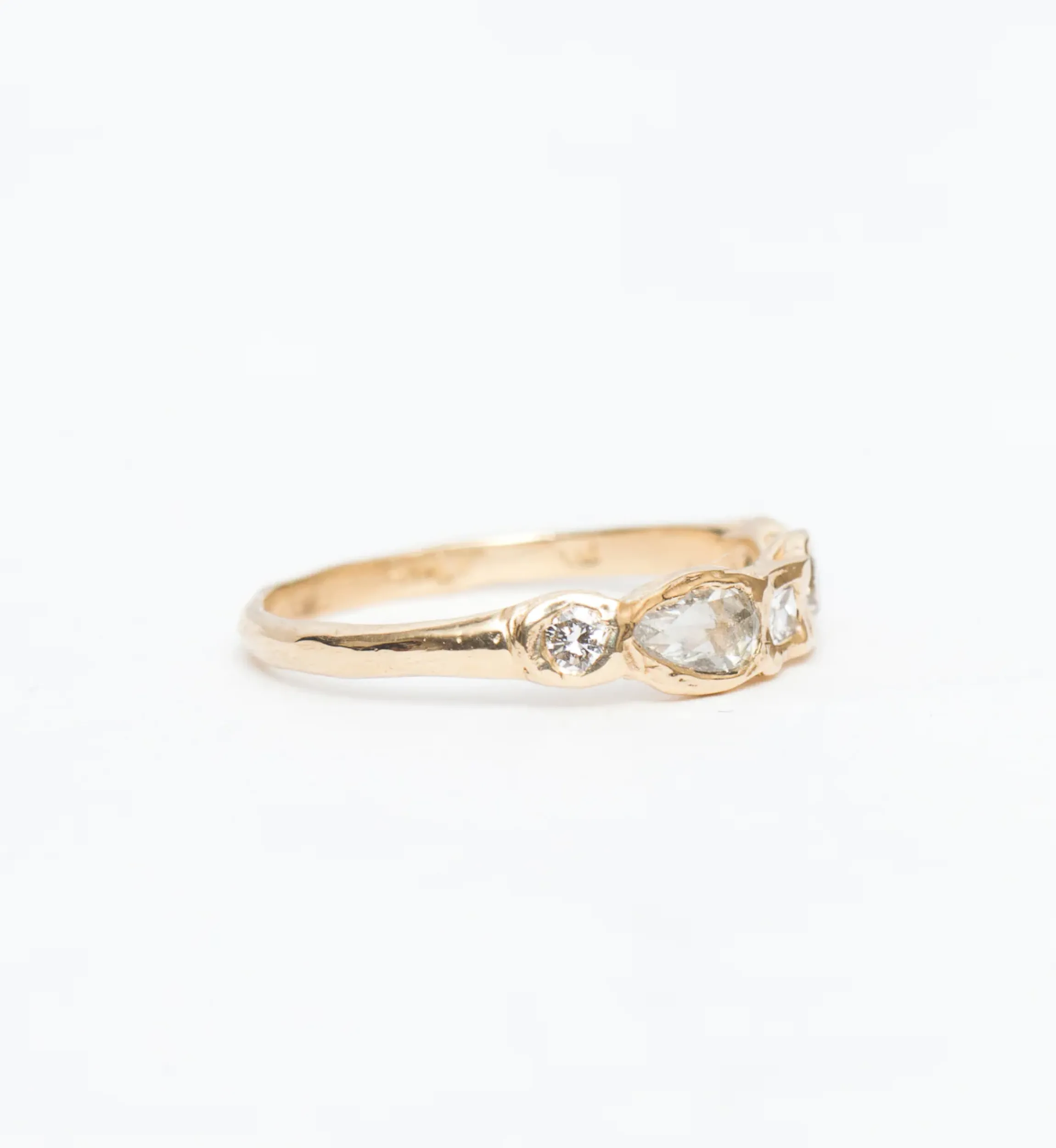 14 karat gold with two round white diamonds, one rose-cut pear white diamond, one princess white diamond, and one marquise white diamond totaling 0.57 carat.