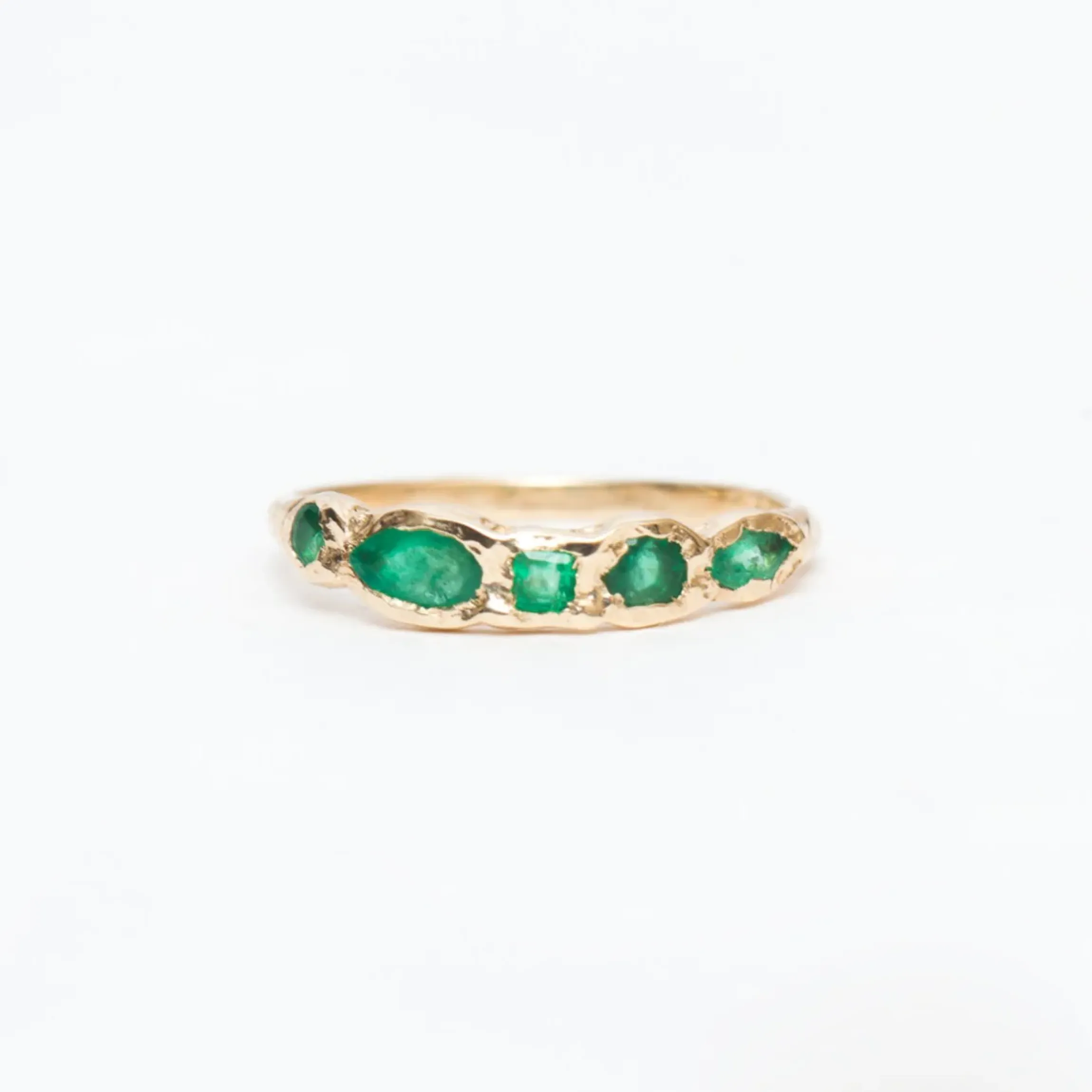 The verdant hues of five emeralds gives this signature Misa ring luxe sparkle saturated with intense color. Designer Misa Hamamoto’s love for nature channels the lush greens of a forest into organic bezel-set gems, making for a stunning complement to her hard-carved designs. Pair it with delicate gold bands for an enchanting mix of shape and hue. Made in the U.S.A.