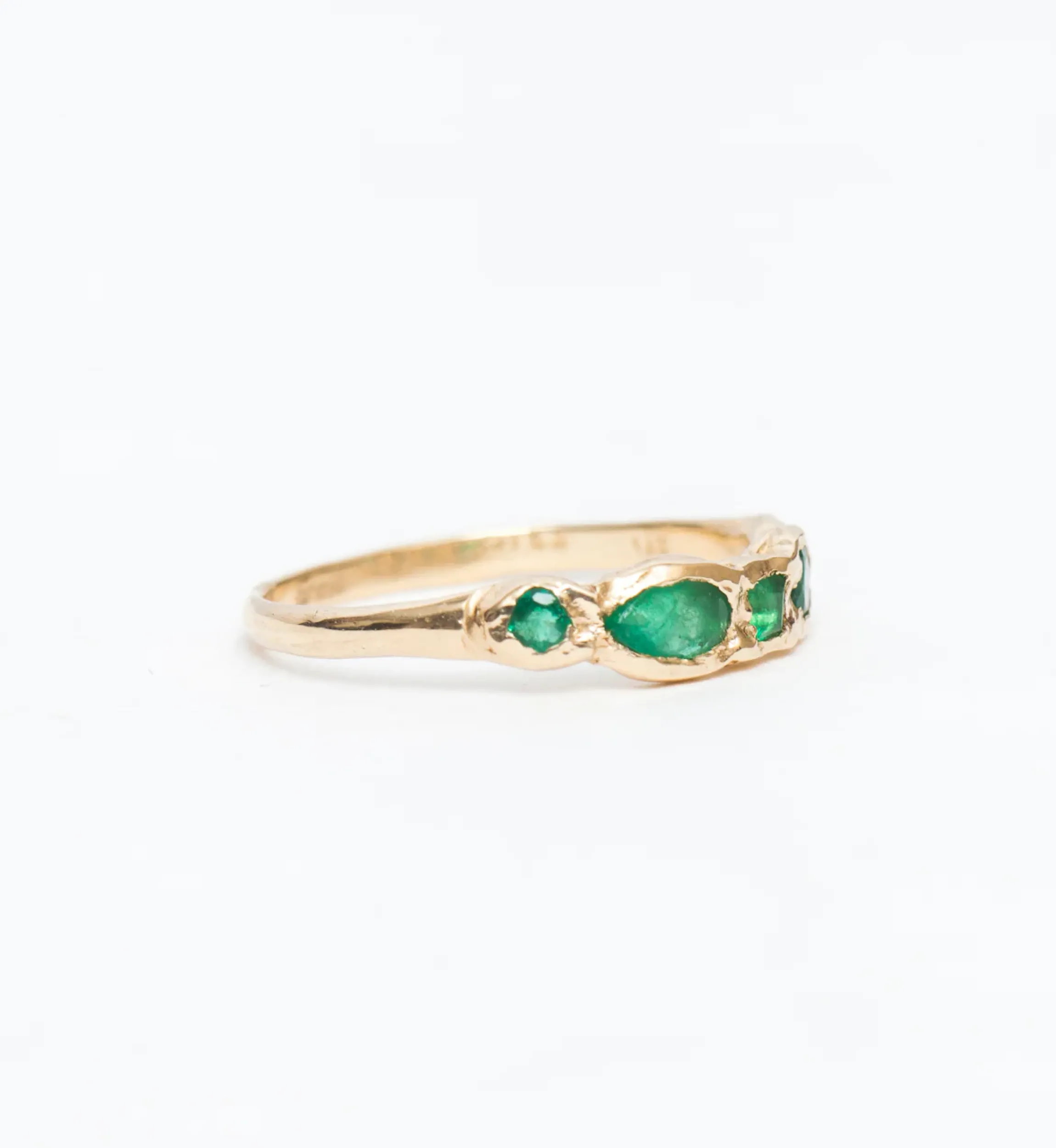 14 karat gold with two round emeralds, one pear emerald, one princess emerald, and one marquise emerald.
