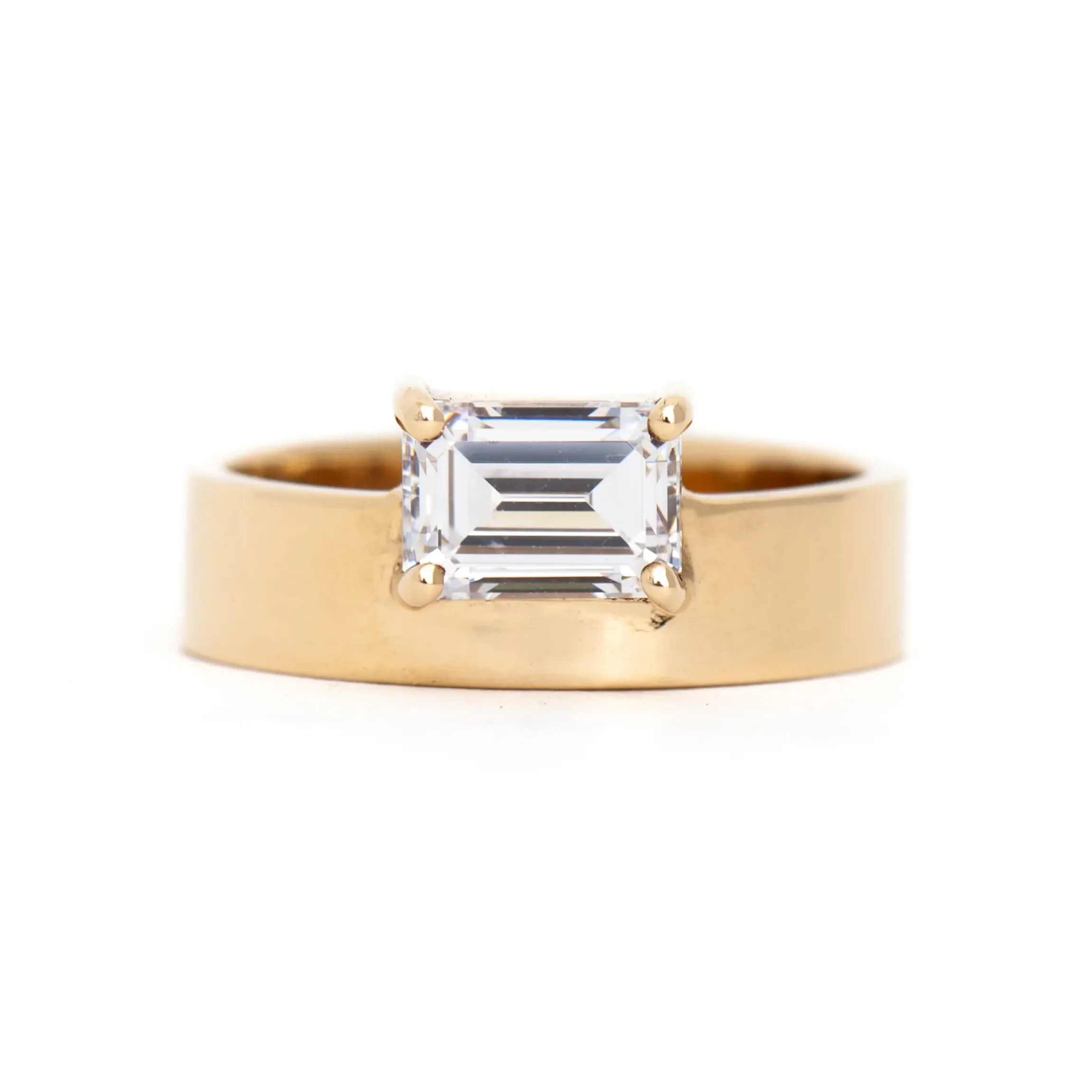 The linear facets of an emerald-cut diamond make a perfect partner to the minimal, structured setting of the Monolith series. Set east-west, the 1 carat center floats effortlessly above the edge of the gold band for a distinctly new take on the solitaire. Stack it with WWAKE’s organic, contoured rings to break the rules and make your own traditions. Made in the U.S.A.