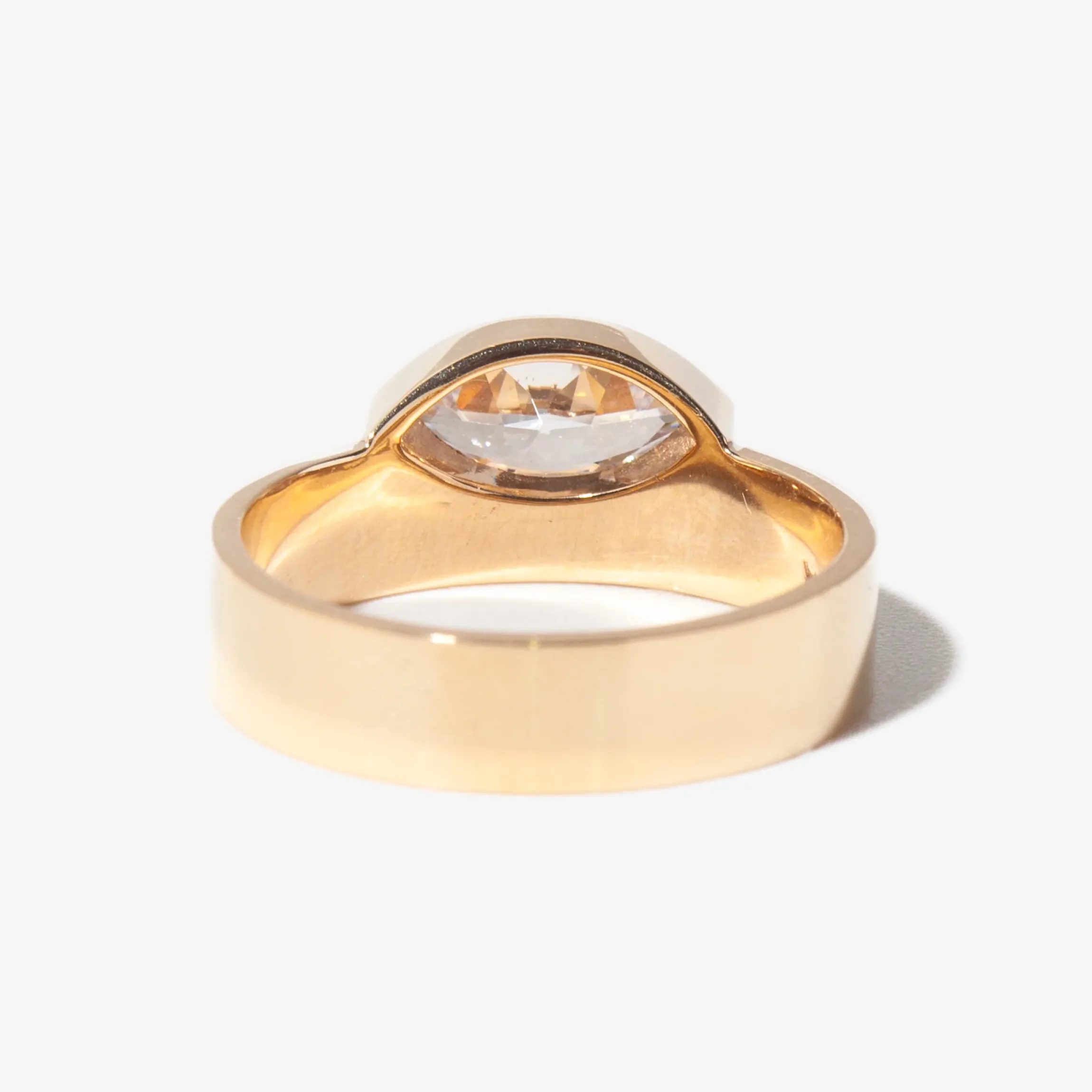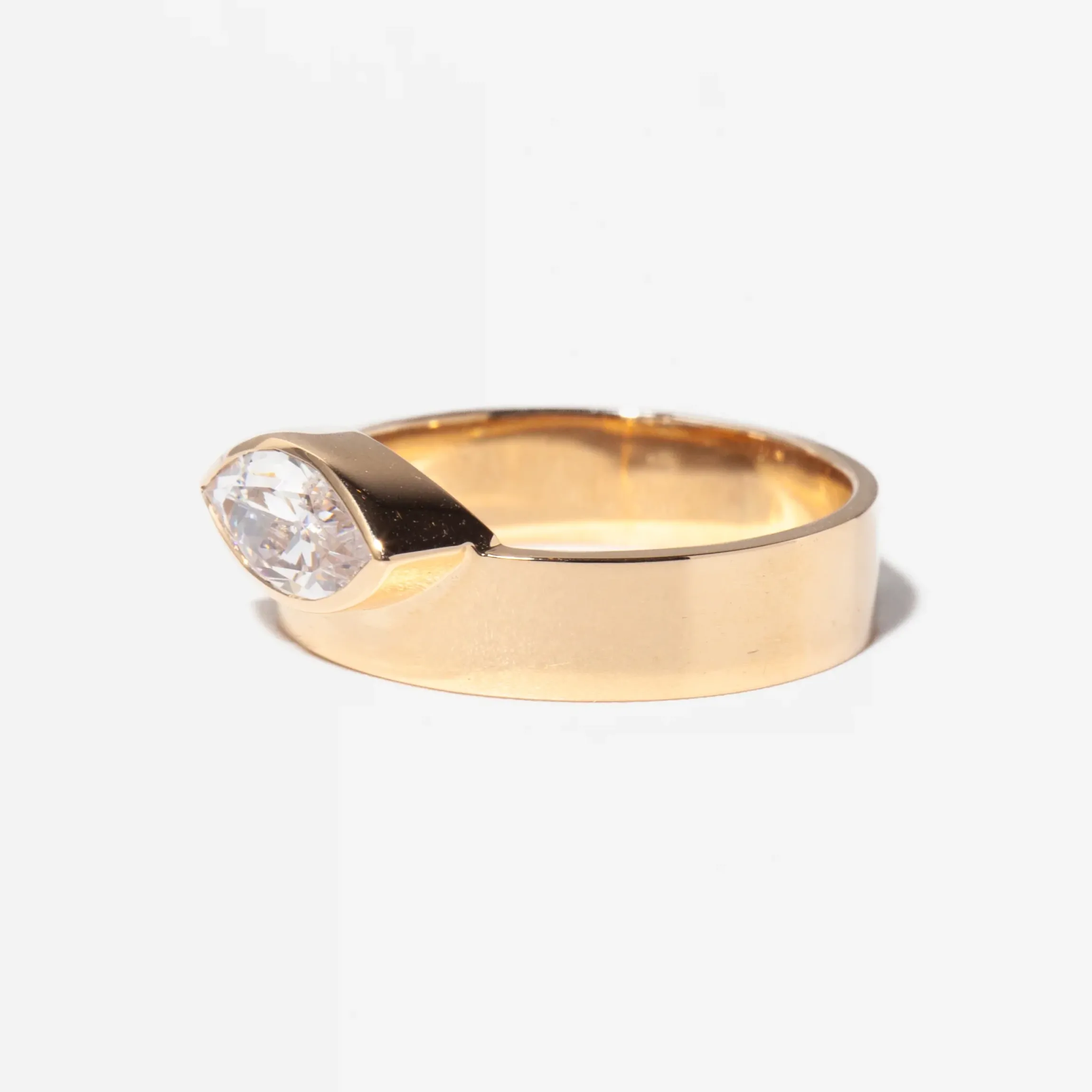 The tapered ends of a marquise diamond merge seamlessly into the thick band of this signature WWAKE design. An east-west setting translates the elongated silhouette of the diamond into a gestural, curvaceous form on the hand. Accentuate its understated majesty with a pavé band or pair it with gold stackers to let the diamond take center stage. Made in the U.S.A.