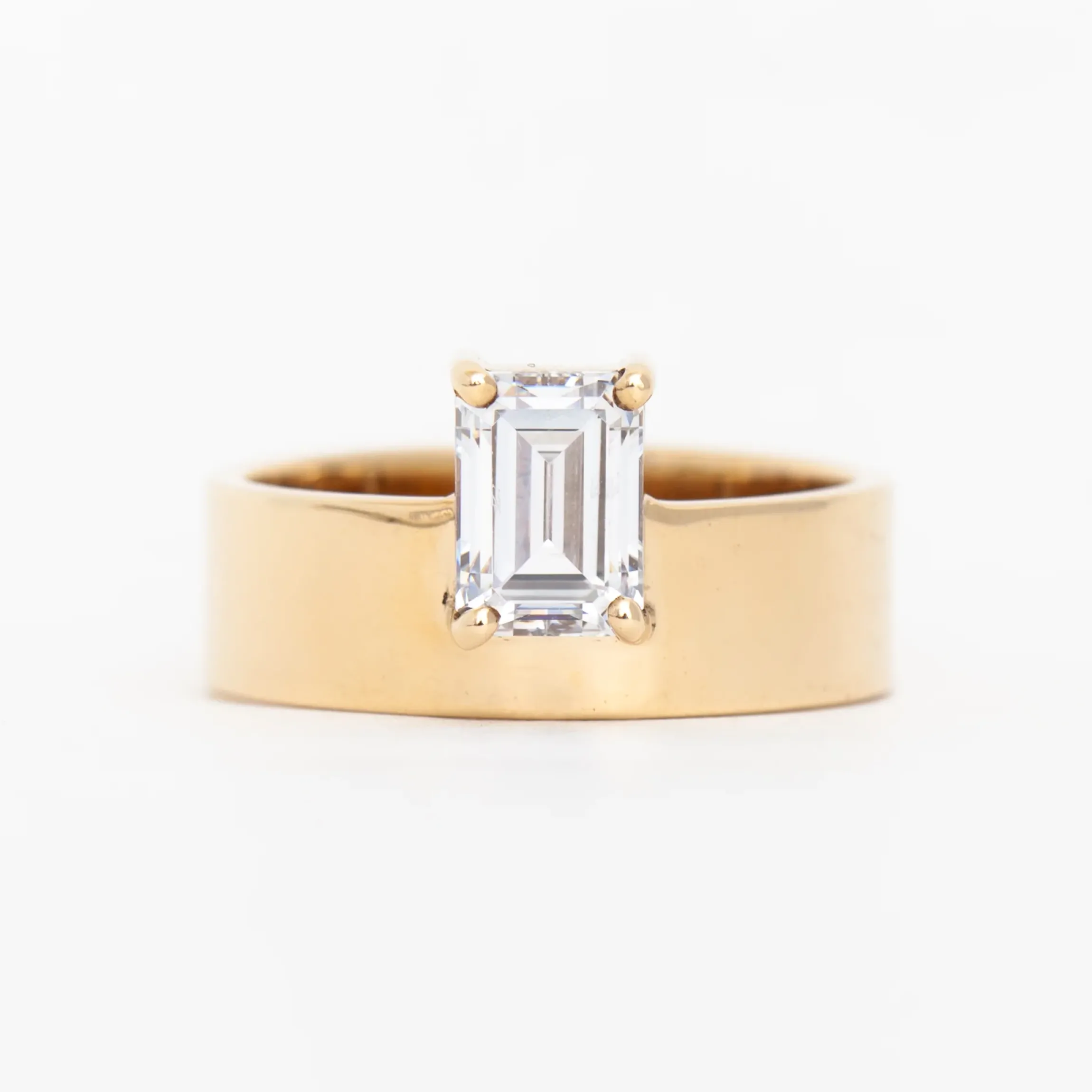 14 karat gold set with one reclaimed, post-consumer 1.00 carat emerald-cut white diamond (F/G color, VS2 clarity).
