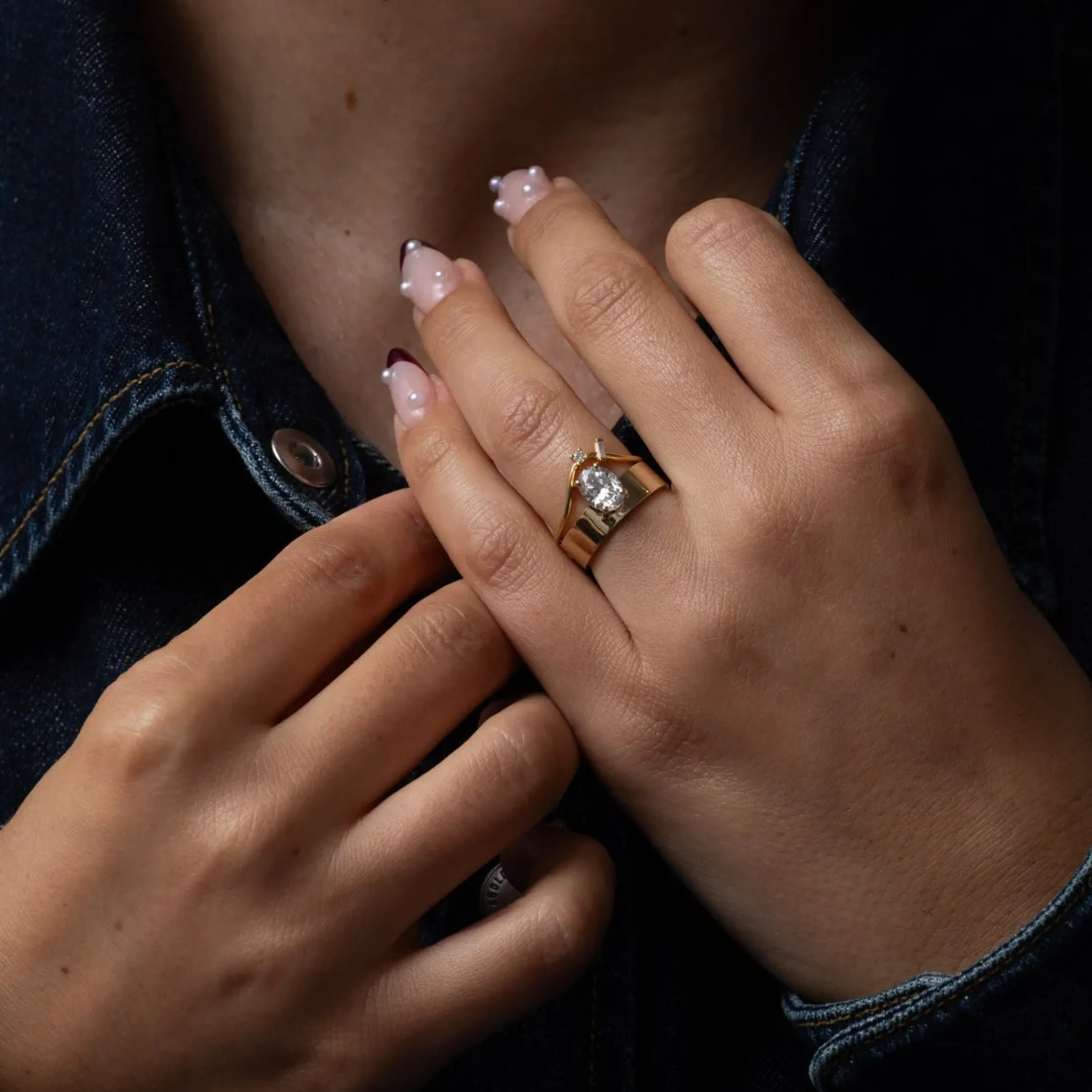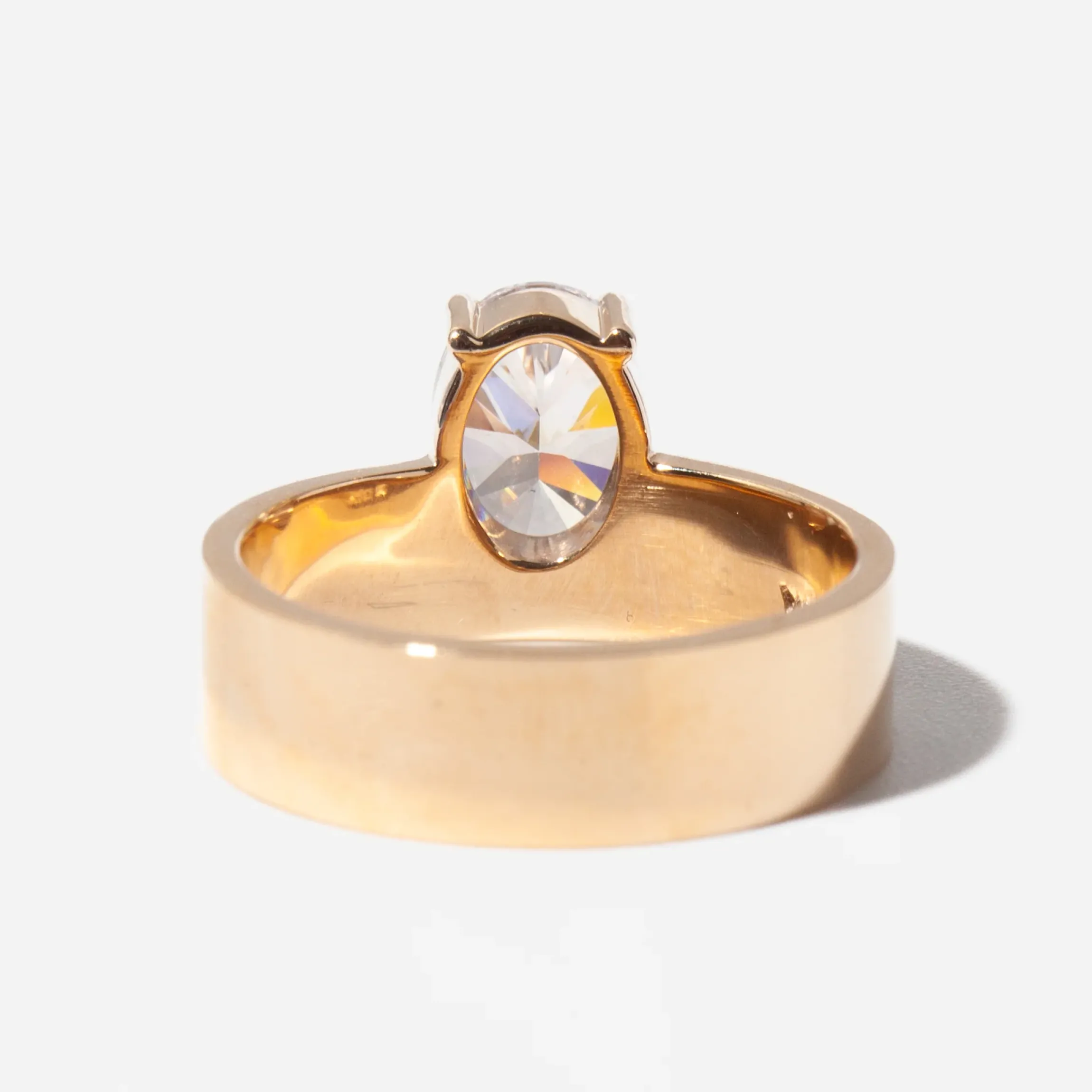 Diamond and metal form a unique relationship in this distinctive solitaire by WWAKE. By questioning everything you know about tradition, designer Wing Yau lets you forge your own, setting an oval diamond in a four prong basket that floats out from a thick, substantial gold band. Pair it with a timeless diamond eternity band to merge modern style and traditional sparkle. Made in the U.S.A.