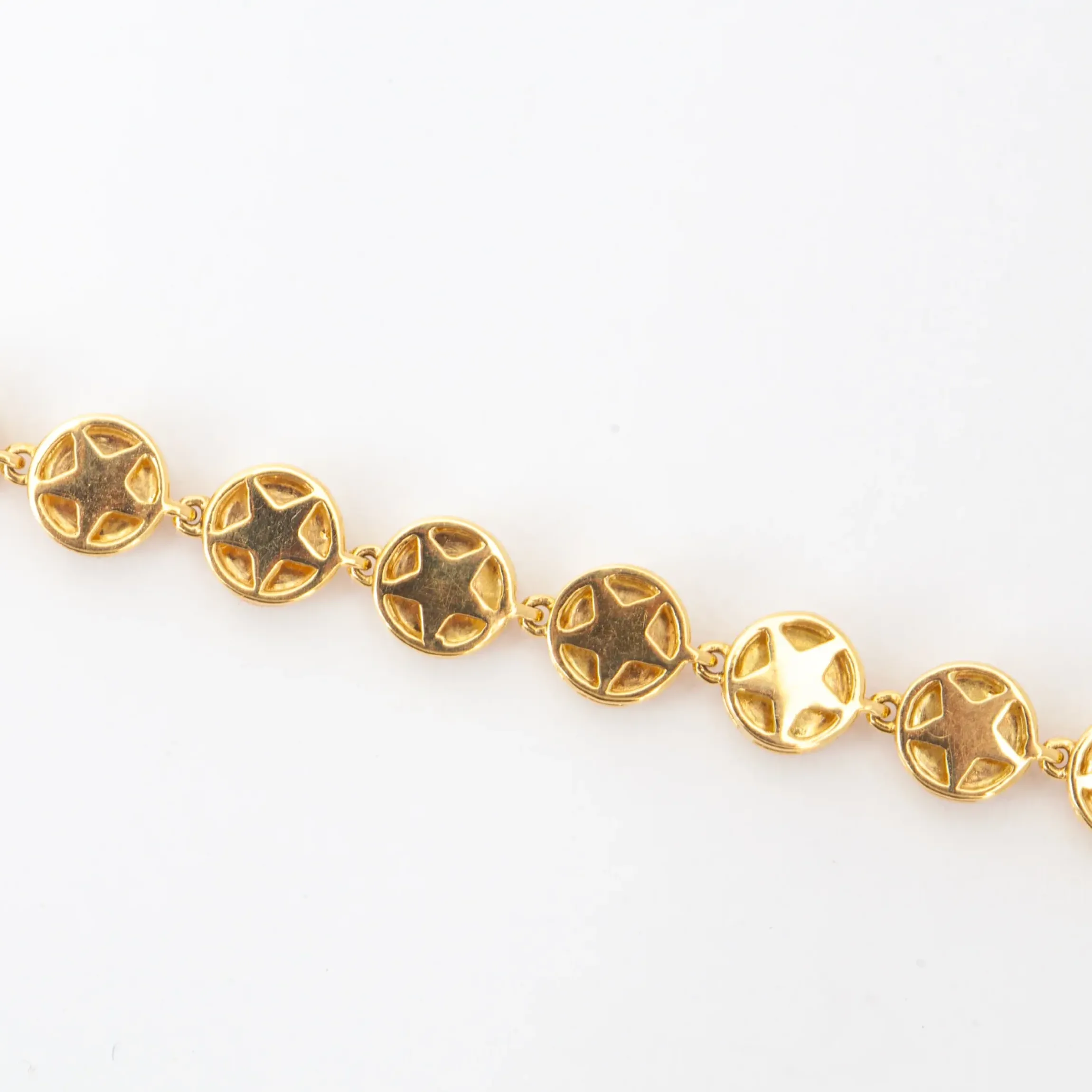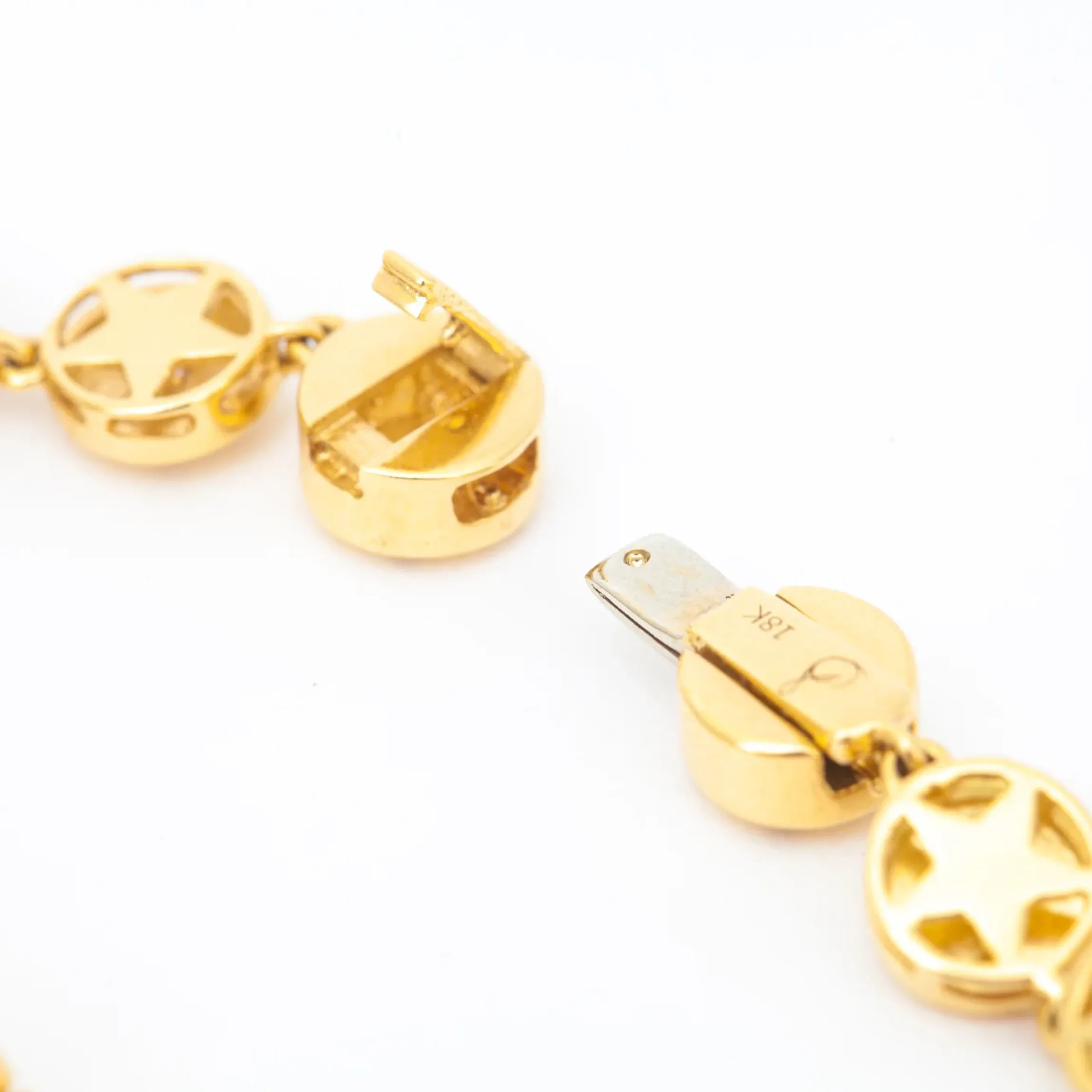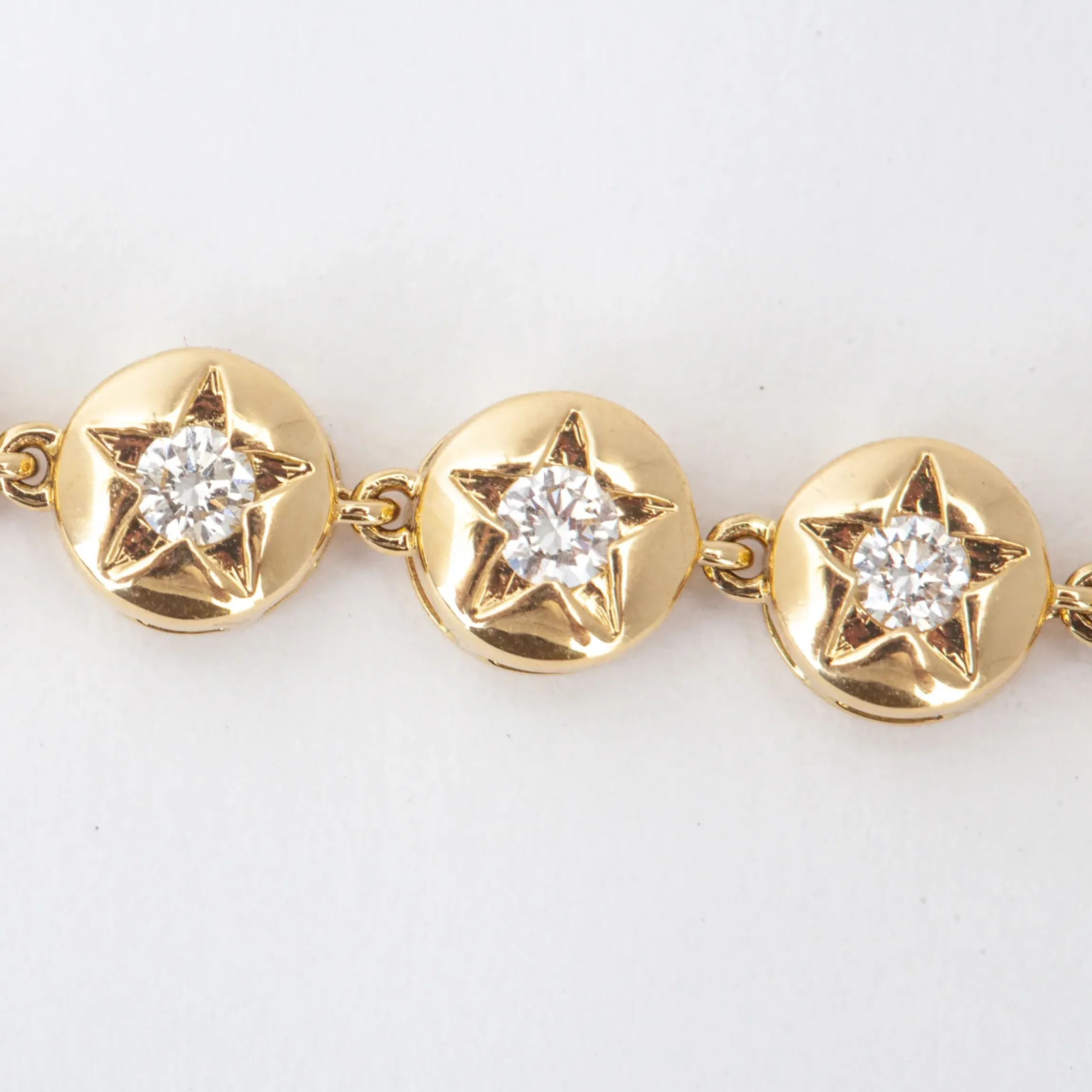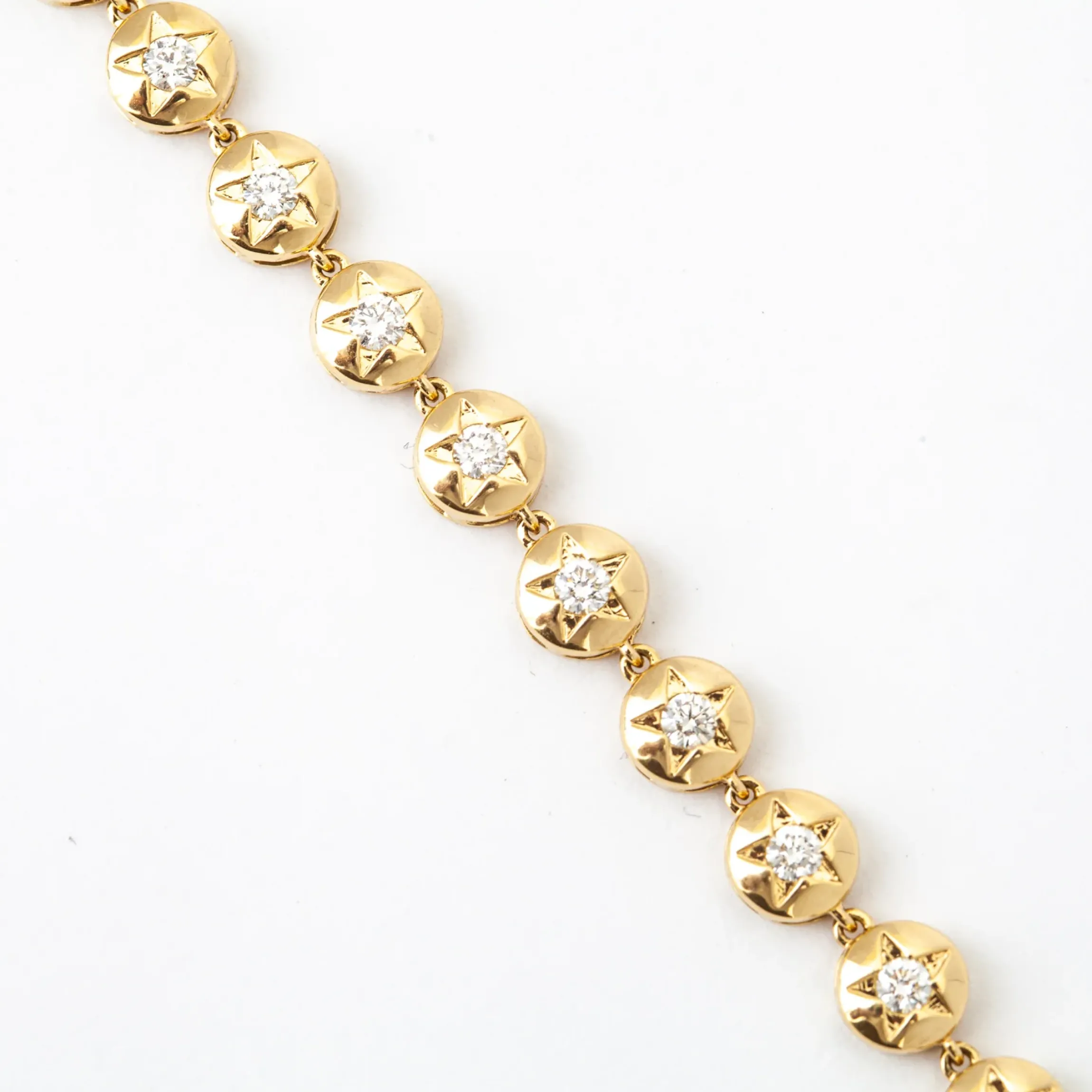 We can guarantee you have never seen a tennis bracelet like this before. Designed for those who want to make a statement with their jewelry, this bold diamond bracelet is truly a showstopper. Adorned in gorgeous gold star details and round white diamonds, this is a beautiful piece from New York jewelry design house, Sorellina. There is a harmonious dichotomy by seamlessly blending opposing ideas of feminine with masculine and vintage with modern. Finished with a lock clasp.