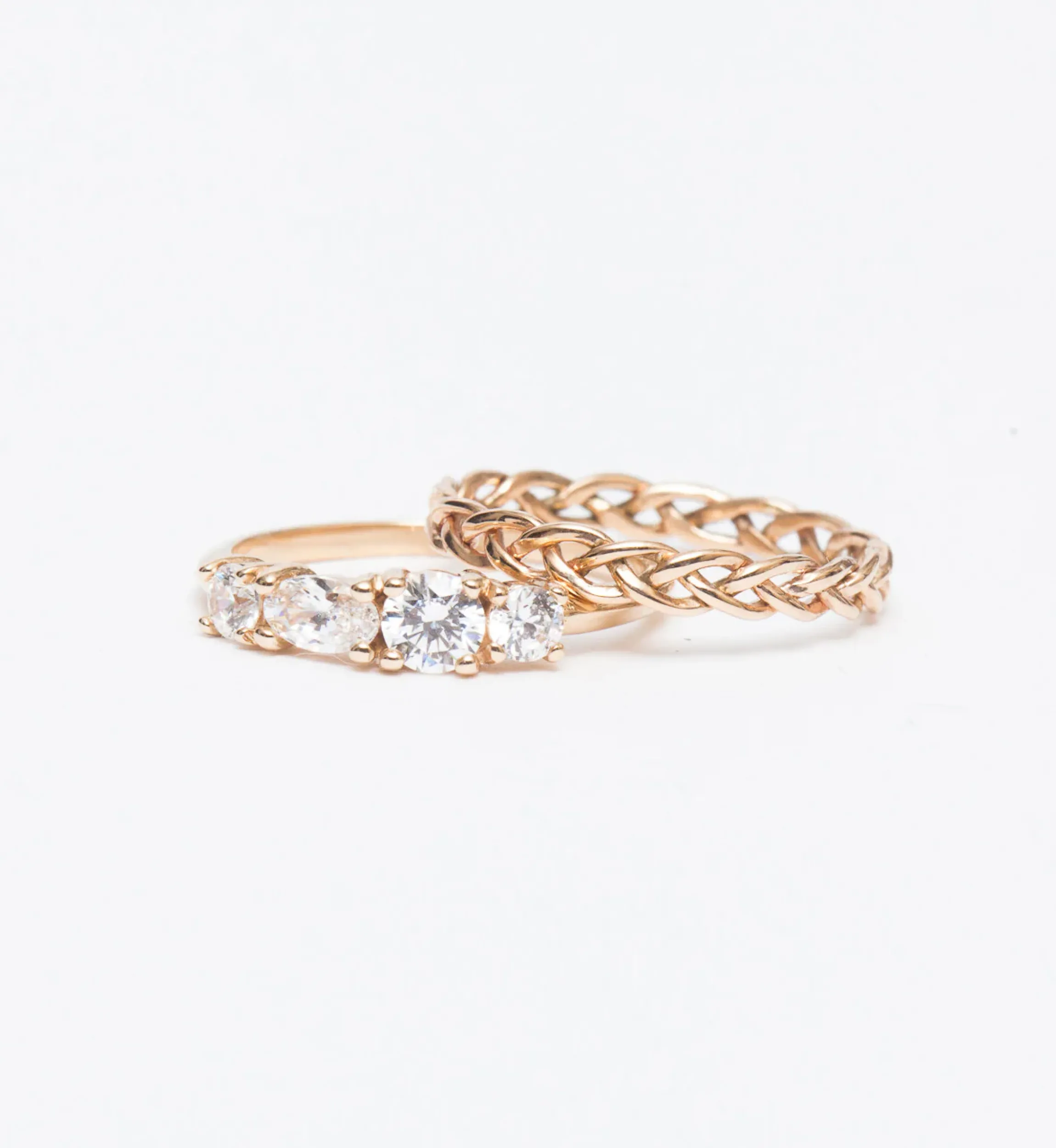 14 karat reclaimed gold with 0.60 carats of diamonds (one 5 x 3 mm oval, one 4 mm round, and two 3 mm rounds).