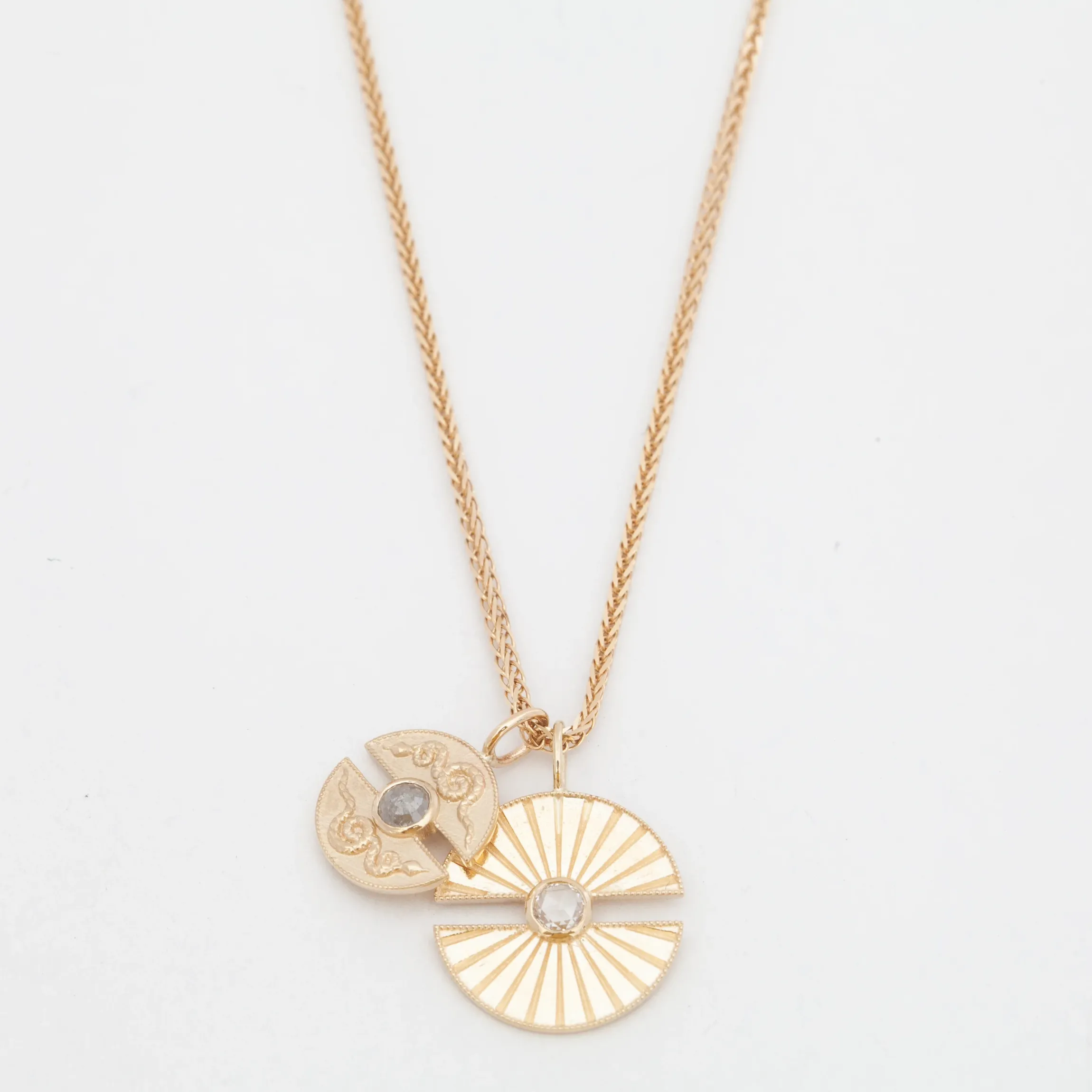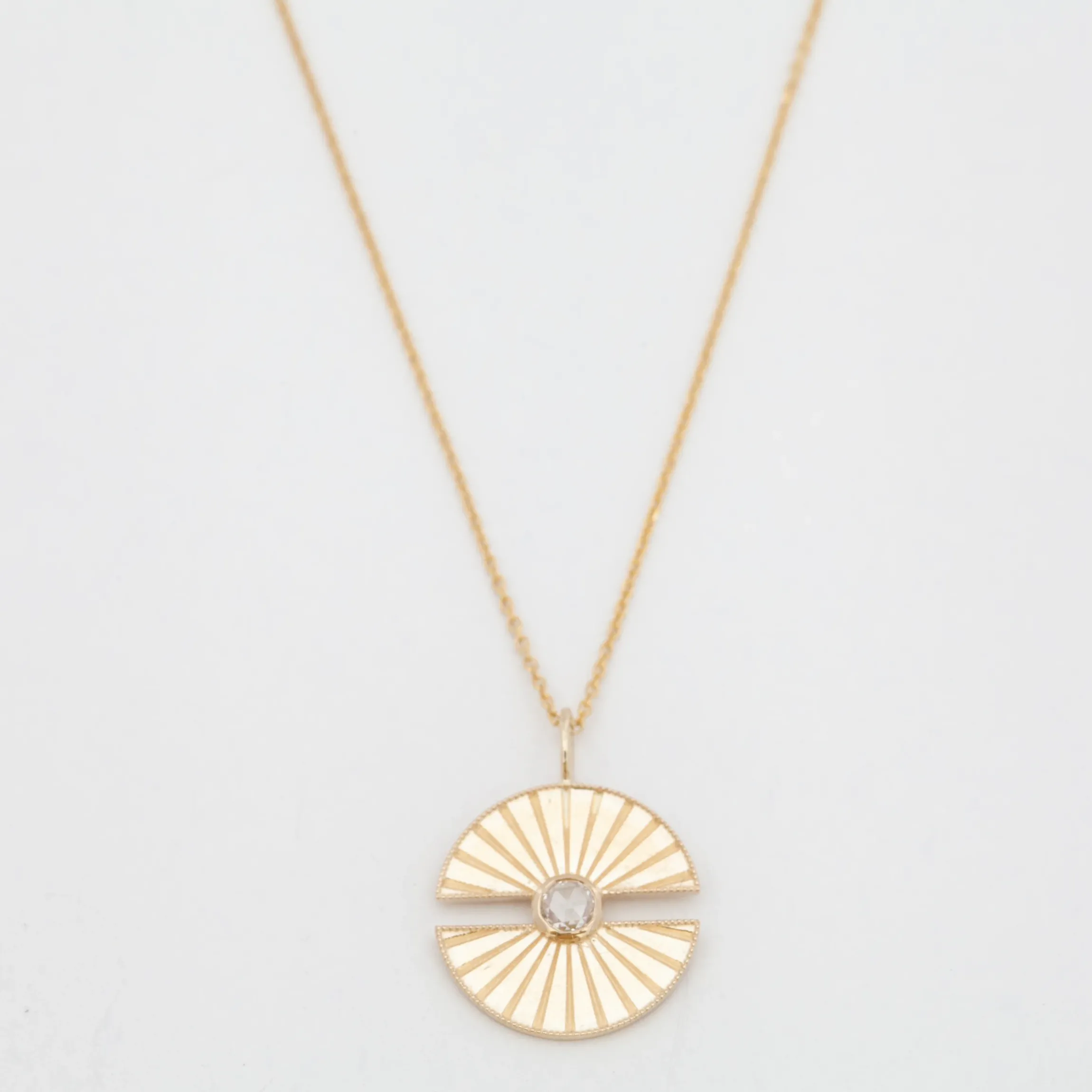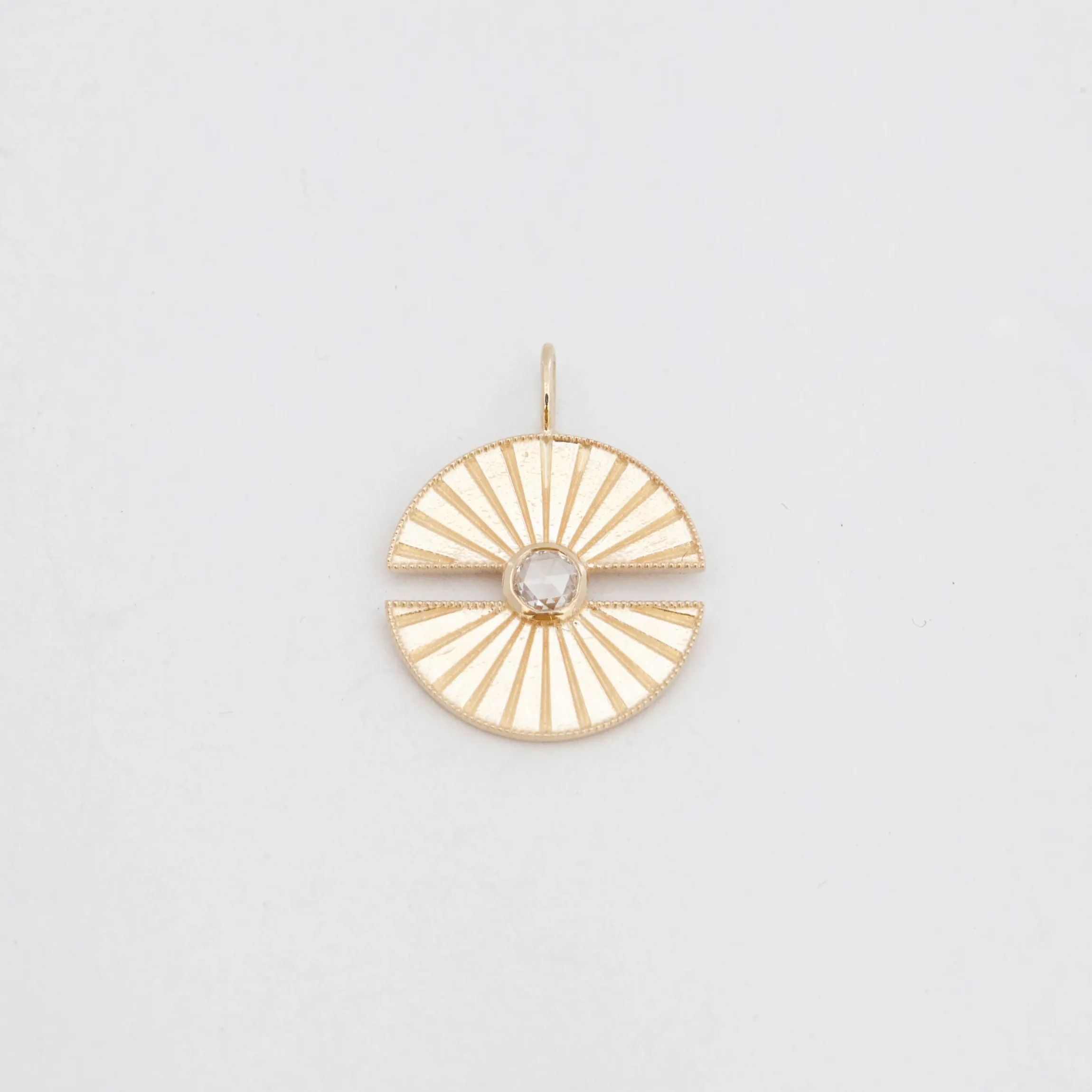 A beaded frame and engraved rays make this diamond pendant the center of your jewelry universe. The broad, flashing facets of a rose-cut diamond are a perfect representation of the sun’s celestial beauty. Wear it as a single, statement-making piece on a more substantial chain or pair it with dainty charms to catch their petite forms in its stunning orbit. Made in the U.S.A.